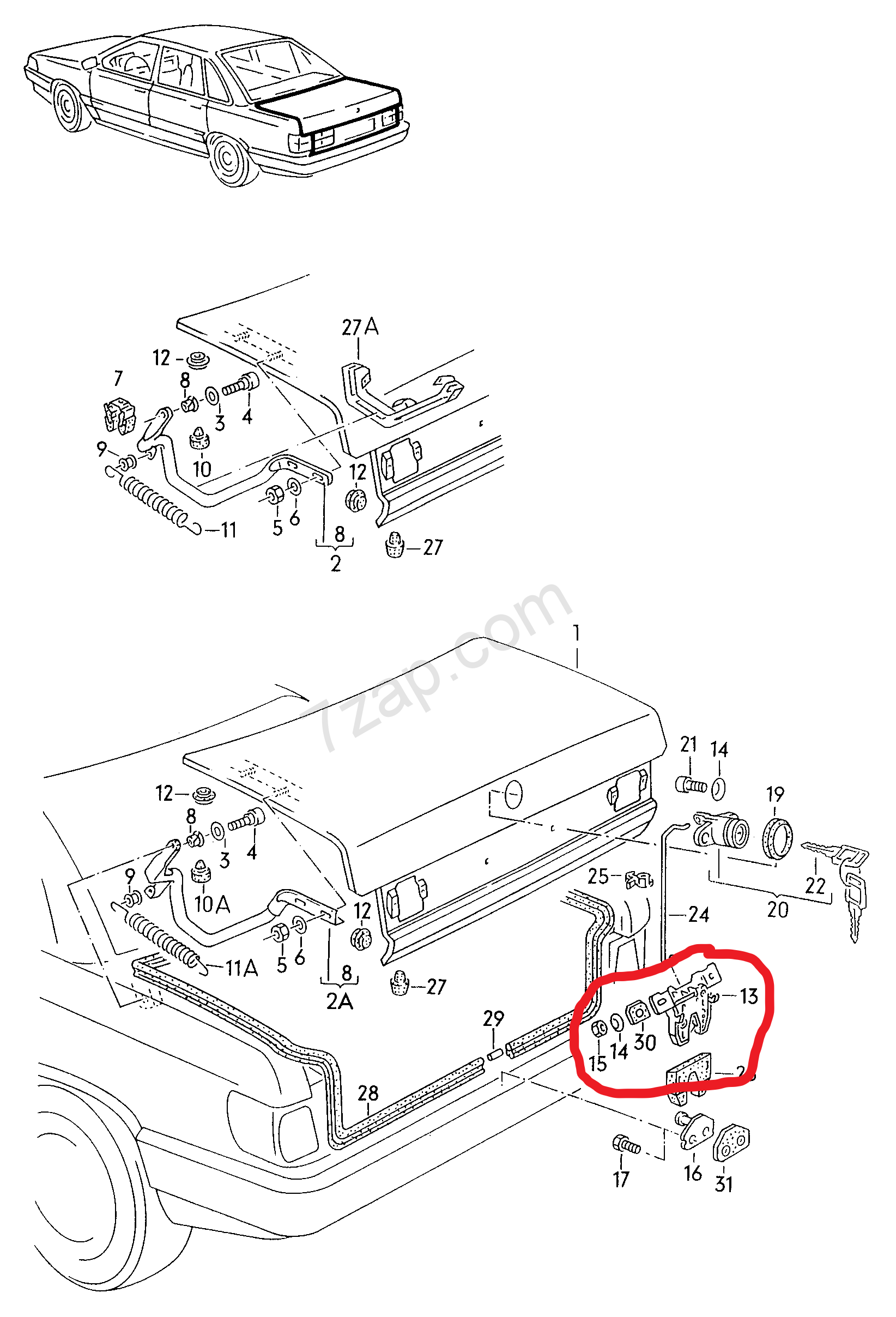 Hallo! Mir sind bei meinem Audi 100 BJ 1985 leider die beiden Bolzen, auf die die selbstsichernden Muttern geschraubt ist, die den oberen Teil der Verriegelung des Heckklappenschlosses (also im Deckel selber) halten abgebrochen. Ich hab mit das mal angeschaut, kann es sein dass diese Bolzen Teil des...