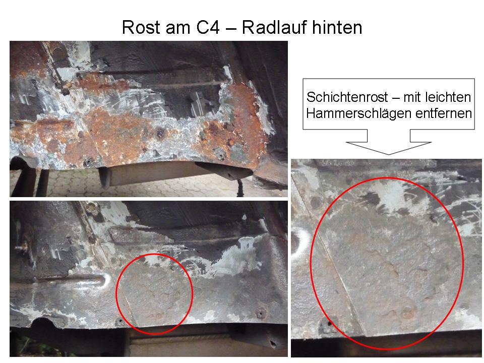 Hallo, was haltet ihr von folgender Vorgehensweise bei beschriebener Problemstellung: Start verrostetes Radhaus. Rost entfernt (leichte Hammerschläge zeigten, daß das Blech schon extrem dünn war). Mit der Flex bis auf tragfähiges Material runtergeschliffen und den Rost weitestgehend entfernt. Fertan...