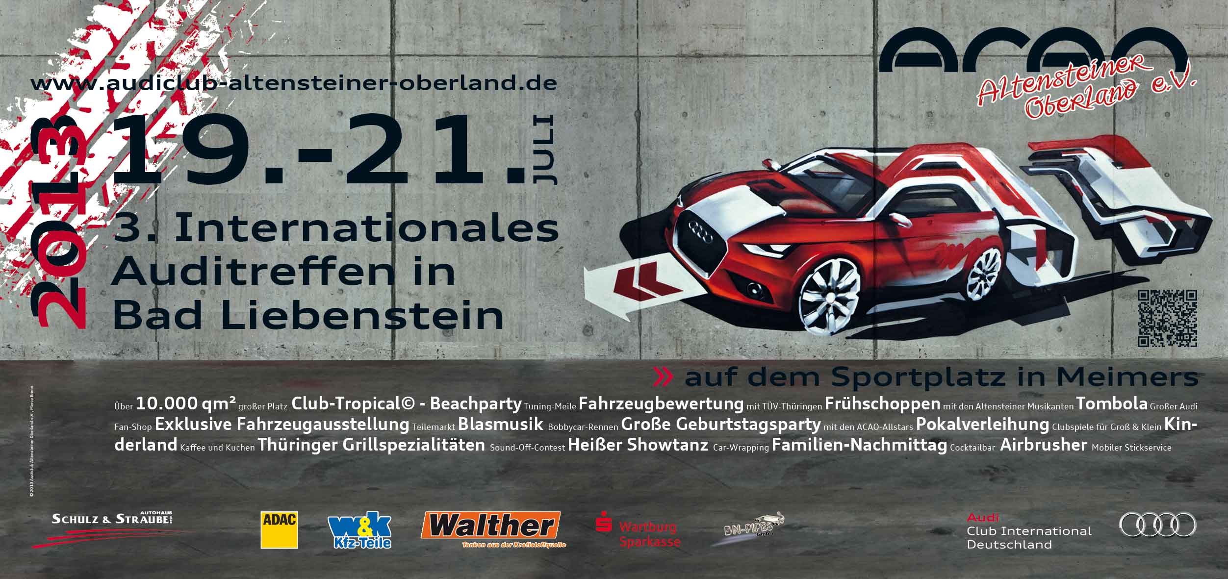 Im Juli 2013 ist es wieder soweit – Es dröhnen die Motoren und die vier Ringe der Marke Audi begeistern wieder im Altensteiner Oberland. Nun schon zum Dritten Mal, begrüßt der Audiclub Altensteiner Oberland e.V. alle Audi-Freundinnen und Freunde aus ganz Europa zum Internationalen Auditreffen in Bad Liebenstein vom 19.07. - 21.07.2013 und sagt „Willkommen bei Freunden".