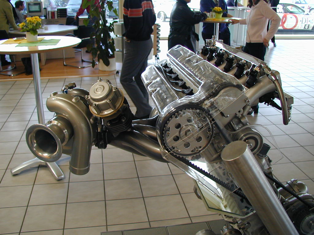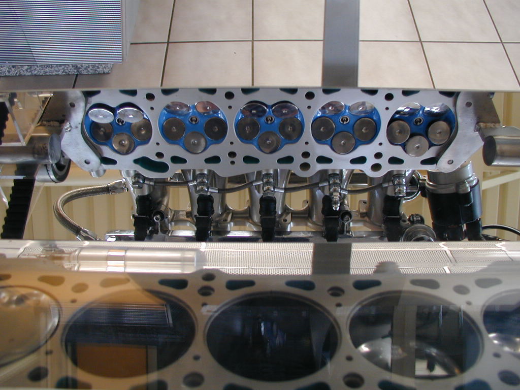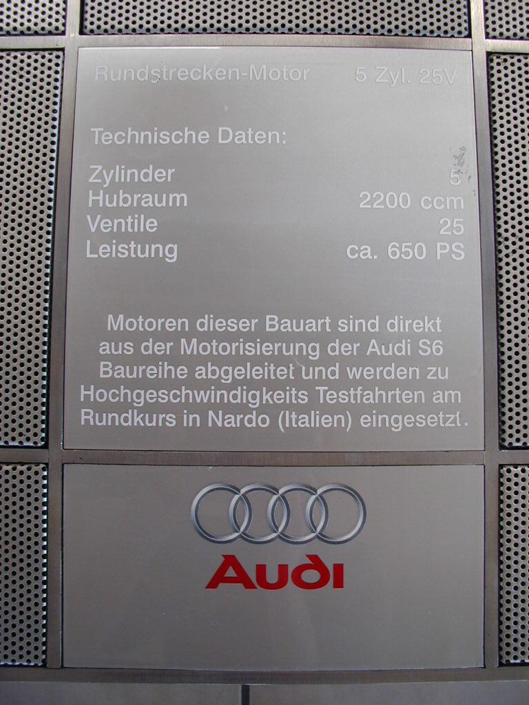 "Der Zweiventiler erhält eine recht beachtliche Kraftkur. Obwohl die Motorinnereien wie Zylinderkopf, Pleuel und Kurbelwelle Serienteile sein müssen, hält der 5-Zylinder drei Rennen von Revision zu Revision. Beachtlich bei 2bar Ladedruck, die im Training für einige Runden auch schon mal auf 2,2bar 'raufgeschraubt werden können. 520PS bei 6200/min und 560Nm bei 4500/min sind schon bei 2bar die respektable Leistung. Der Motor kann bis 8200/min gedreht werden und zeigt so, dass auch 5-Zylinder hoch drehen können! " entliehen von audistory.com