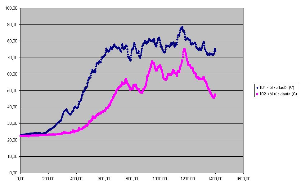 am Start, beide kalt, dann wärmt sich der Vorlauf langsam auf..vermutlich ist das Ölthermostat nocht 100% dicht....doch danach erreich ich einfach maximal nur 90°C im Vorlauf, die Turboölleitung liegt dazwischen..ich nehme mal an, da wird das Öl vom kühler in das Öl vom Motor eingemischt...