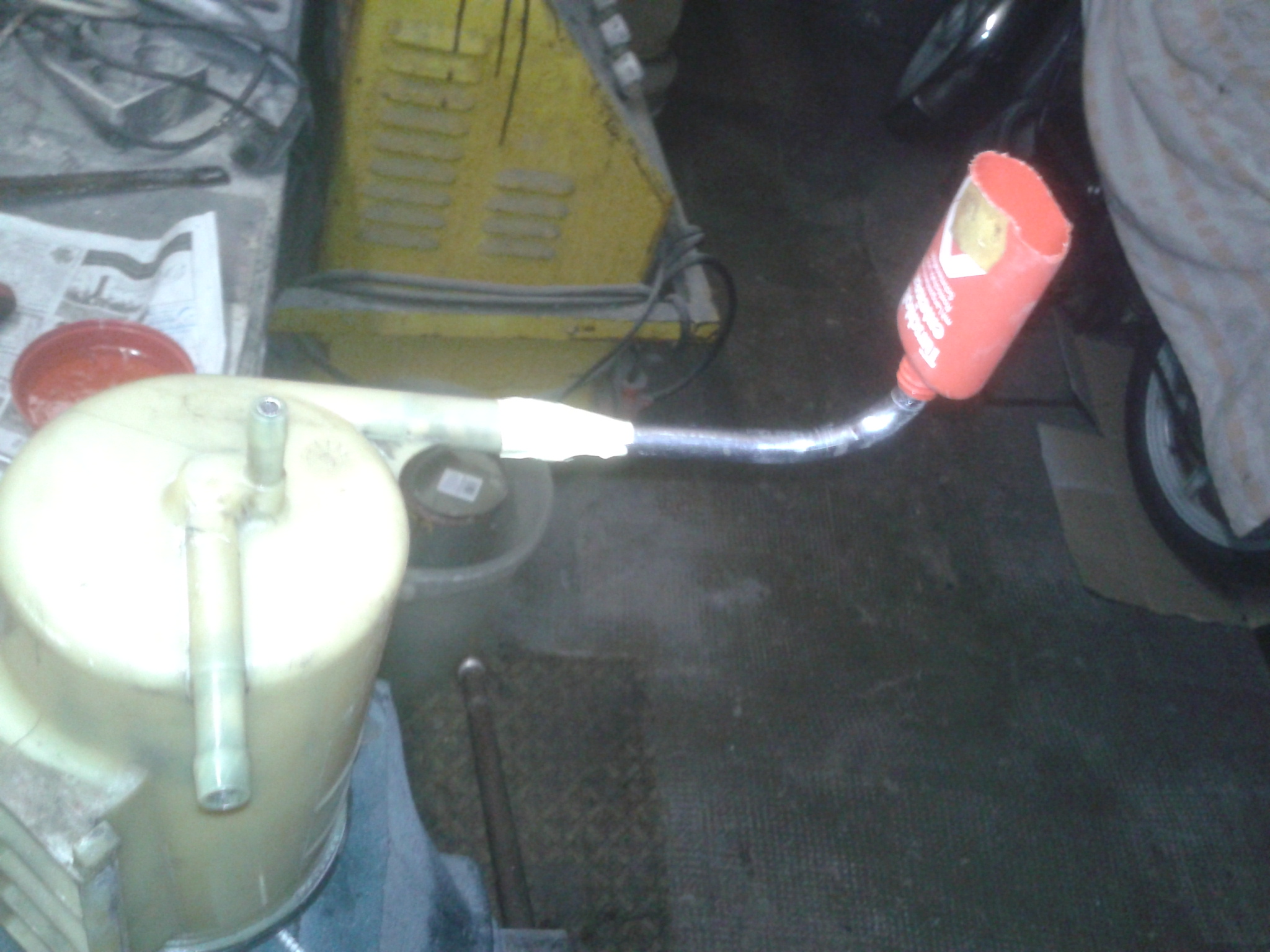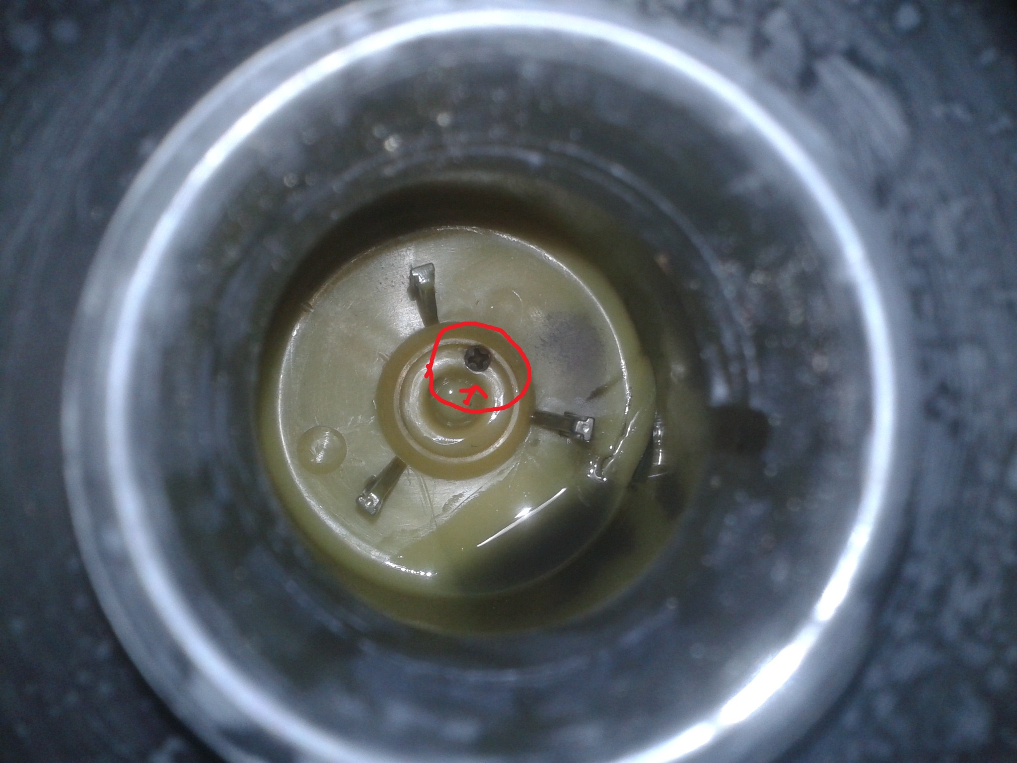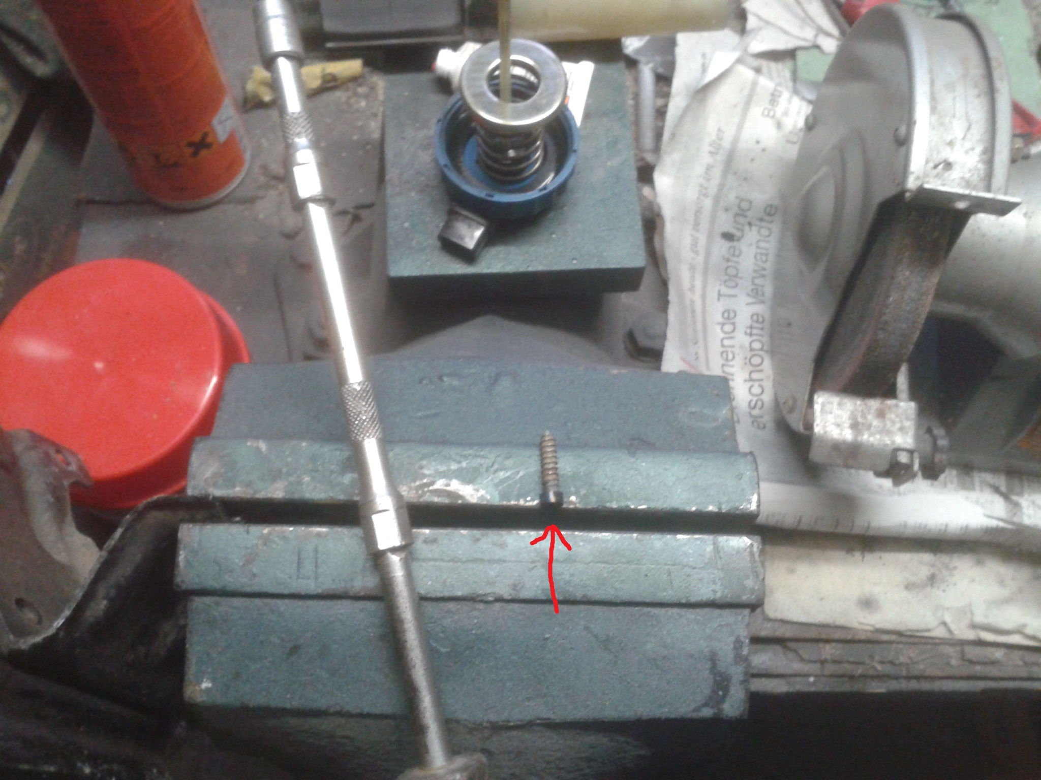 wenn man von oben reinschaut hat man unten ein loch. wenn man bei einer blechschraube den kopf etwas kleiner schleift im Durchmesser,dann past sie genau da rein. dann hab ich den anschluss von unten noch mit epoxyd harz ausgegossen. den oberen anschluss hab ich abgesägt.