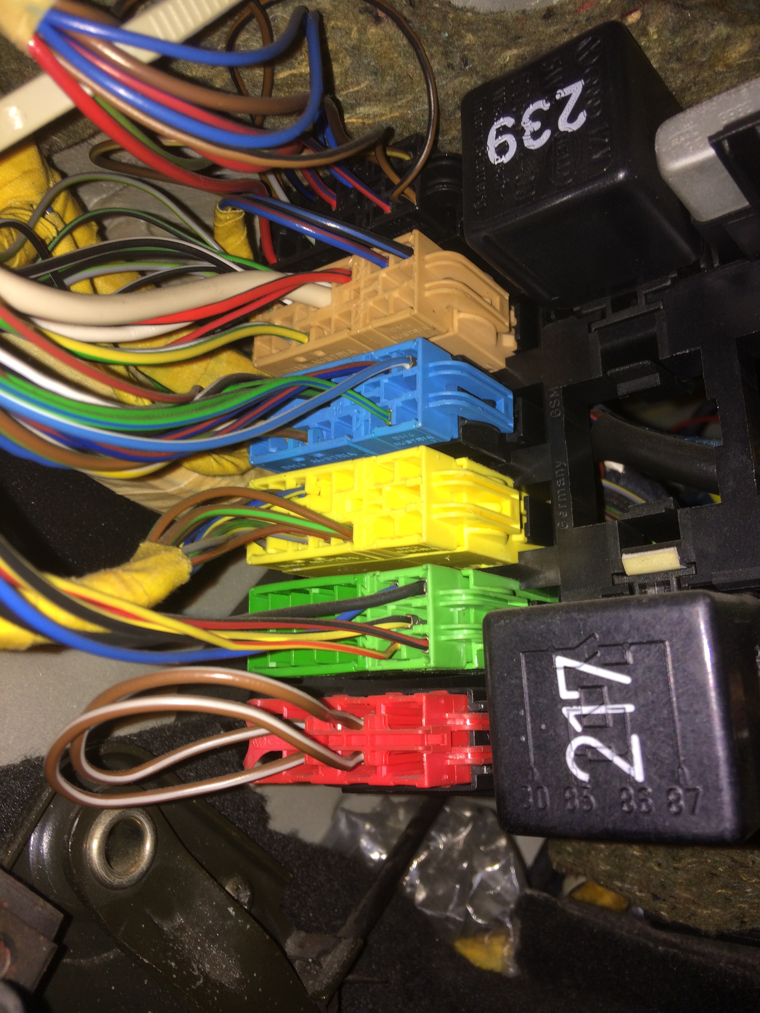 Neben dem Relais-Träger im Fahrerfußraum habe ich einen gelben mehrpoligen Stecker gefunden (siehe Anhang). Ich gehe mal davon aus, dass von diesem Stecker auch die Kabel zum fünfpoligen Stecker hinter dem Kombiinstrument verlaufen. Leider ist es dort unten so eng und finster, dass ich bislang nicht erkennen konnte, wohin der Kabelstrang auf der anderen Seite verläuft...