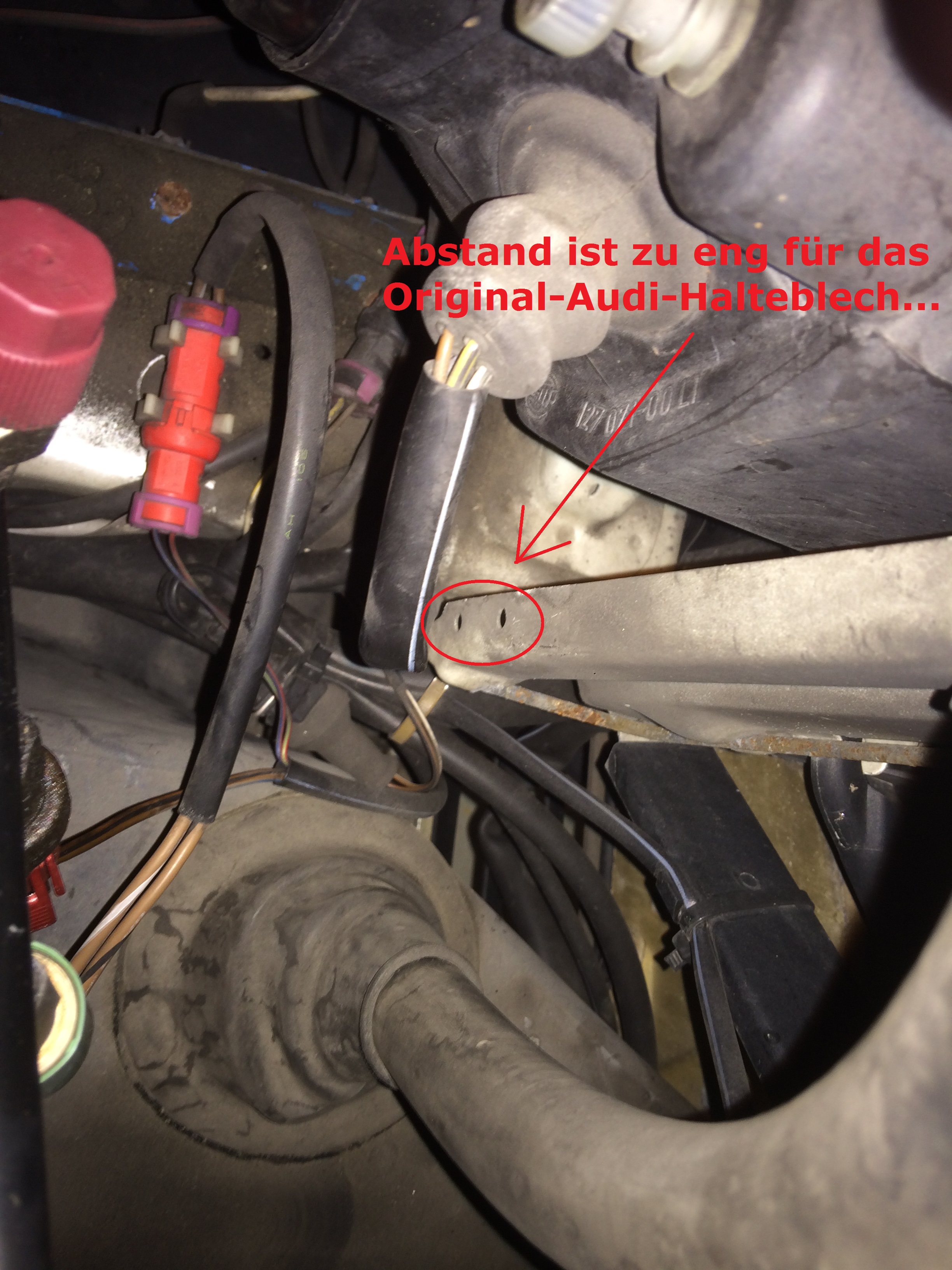 Außerdem bin ich noch am Suchen, nach der originalen Befestigung des ATA-Fühlers. Das Halteblech habe ich mir gekauft, jedoch finde ich hinter dem Scheinwerfer auf der Fahrerseite nirgends zwei Löcher mit dem passenden Abstand... An einer Strebe ist der Fühler für die Klimaanlage verbaut, dort sich aber keine Löcher zur Montage eines zweiten Fühlers. Das Kabel, das mir verkauft wurde, hat vom Fühler bis zum zweipoligen Stecker eine Leitungslänge von ca 95 cm. Ob das nun aus einem Typ44 oder einem anderen Audi-Modell ist, kann ich leider nicht sagen. Um damit in den Innenraum zu kommen, scheint mir das Kabel aber zu kurz...