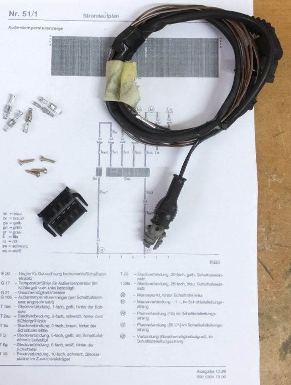 Dein Fühler ist schon richtig 2 polig mit Stecker, damit man beim Defekt einfach austauschen kann, dann 2 poliger Gegenstecker, mit 1. Leitung auf einen Massepunkt, die 2. Leitung in den Innenraum zum 1-poligen Stecker