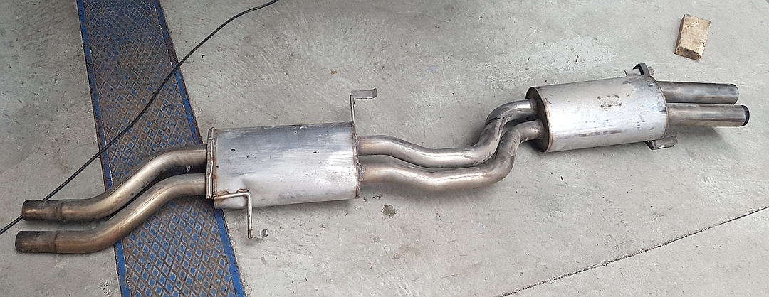 unter meinem gekauften 20V Avant, hing diese Auspuffanlage. Außer einer Plakette mit der Beschriftung "Audi Typ 44 100 200" hat sie keinerlei Beschriftungen. Besonders sind die zusätzlichen Endrohreinschübe. Man kann den Dämpfer mit und ohne Einsätze fahren.