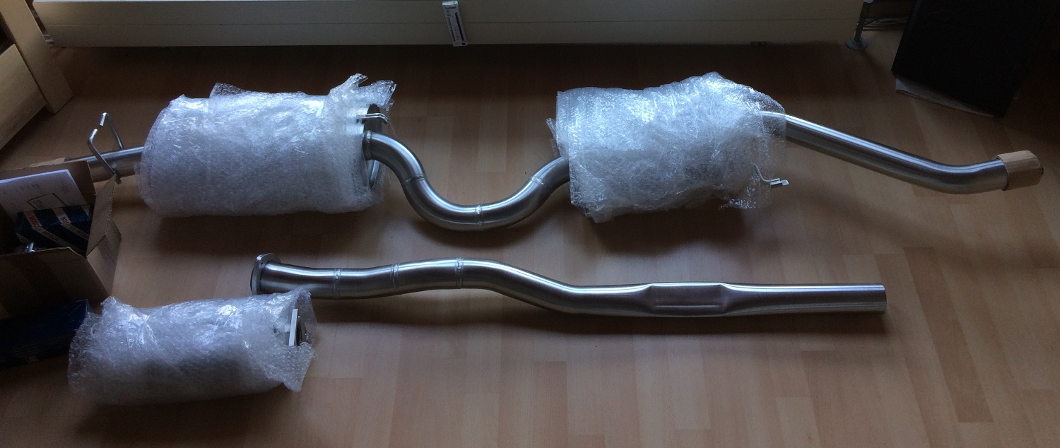 soooo - nachdem die Lieferung der Abgasanlage nun ankam, sitzt die Anlage jetzt endlich unter dem Avant... Ich bin gespannt, was der TÜV spricht: Eintragung per Einzelabnahme oder nicht? Der Kat ist auch neu. Die Anlage macht einen sehr guten Eindruck, alles sauber gearbeitet.