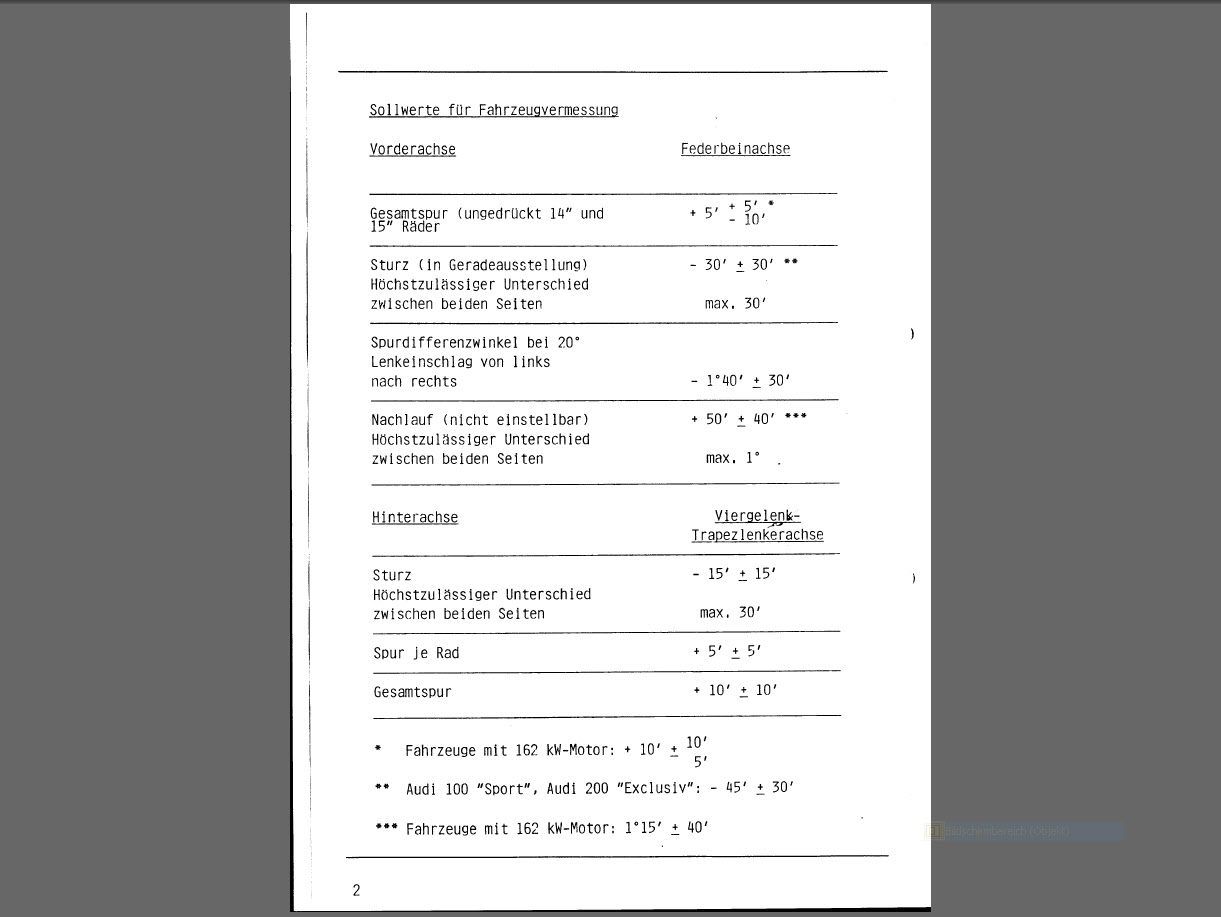 Habe einen 86er T44 Avant Quattro 2,2 KU. Seit kurzem habe ich ein Sportfahrwerk drin (KAW 55/35, Bilstein B8), jetzt rüste ich gerade sämtliche Fahrwerkslager auf PU um. Für die Eintragung musste ich mit Spur/Sturz ein wenig tricksen, demnächst geht es zur Achsvermessung. Ich fürchte aber, daß ich sowohl vorne, als auch hinten ein Problem bekomme, wenn ich ihn auf die Serienwerte einstellen lasse. Darum meine Frage: