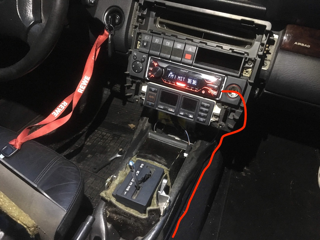 Rechte Ecke der hinteren Sitzbank: Hier sind die Lüftungsgitter der hinteren Mittelkonsole bereits ausgebaut, die Kabel habe ich mit meinem Kleiderbügel unter dem Teppich bis dahin durchgefädelt: Verlauf neben dem Lüftungsschacht: Alles fertig, das Radio hat Empfang: Hinterher muss der Patient nur noch wieder zugemacht werden.