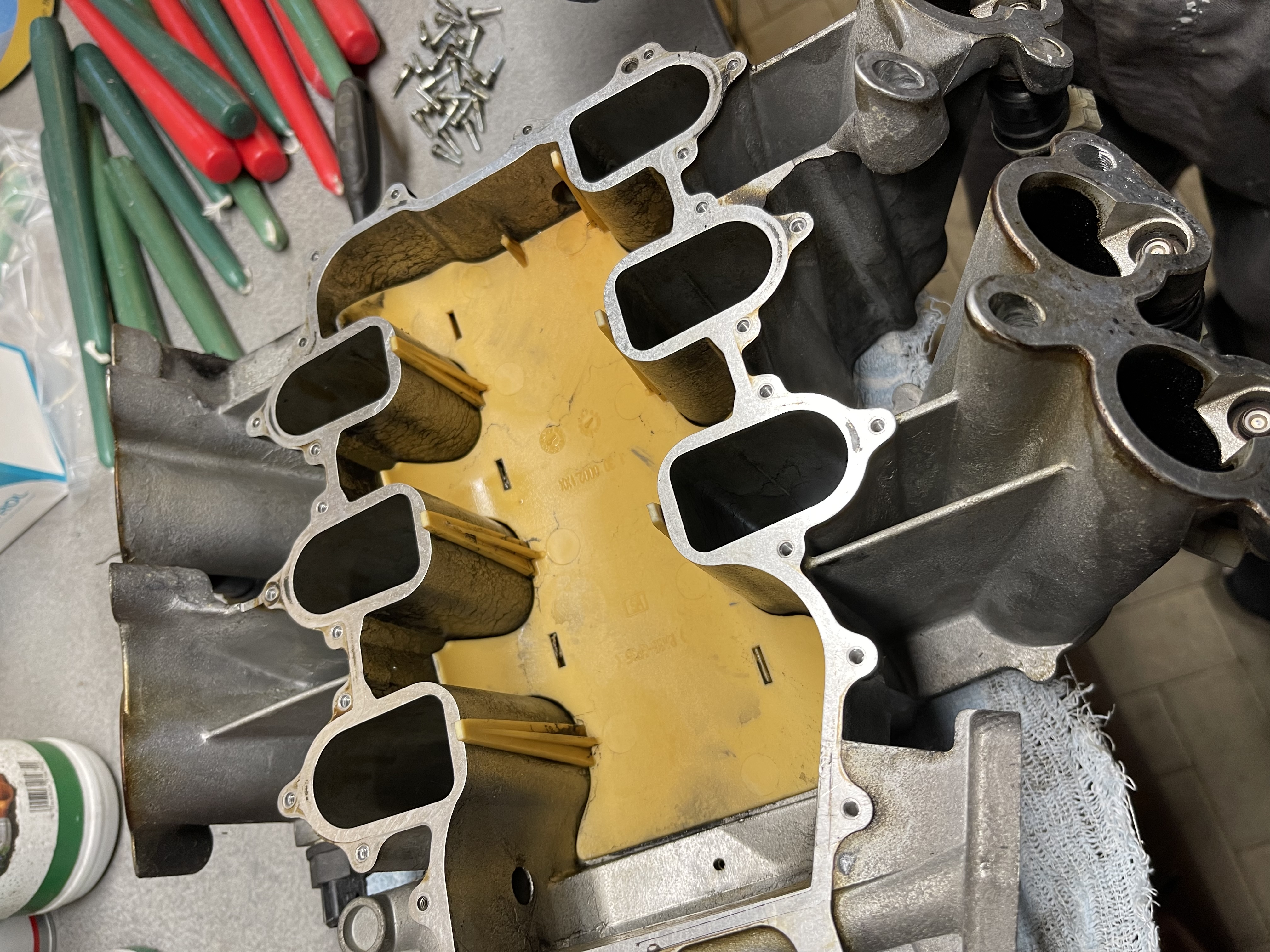 Gesagt getan, Ansaugbrücke abgenommen und auseinandergenommen. Doch siehe da: Der Volumenreduzierer ist gänzlich unbeschädigt und der untere Teil der Ansaugbrücke (aus Kunststoff) ebenfalls.