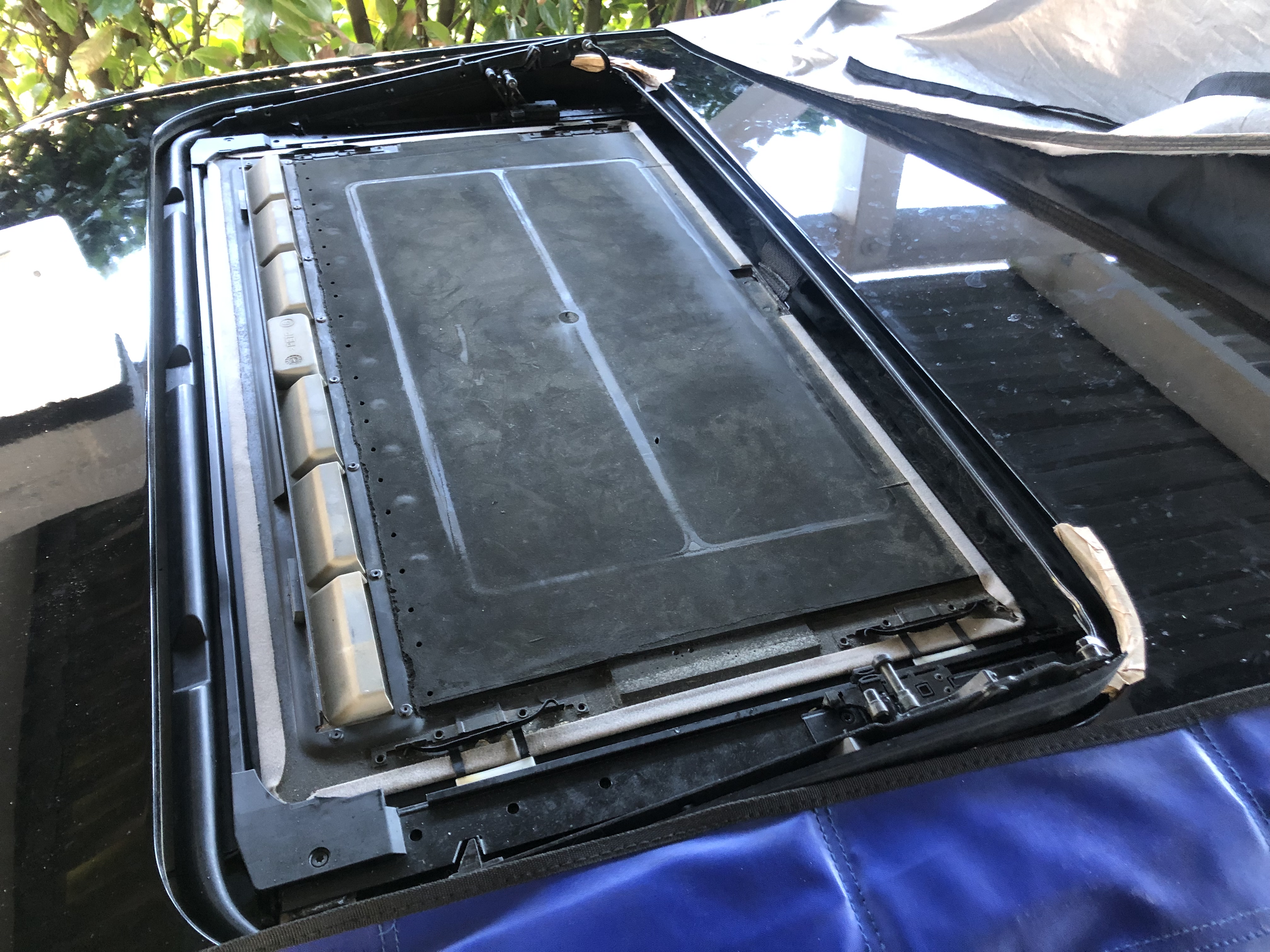 Zum Schluss kam ich dann darauf, dass sich die Wasserrinne des Schiebedaches verabschiedet hat, im hinteren Bereich liegen geblieben ist und für die Geräusche sorgte (erkennbar an der Mechanik des aufgestellten Schiebedachs --> li/re jeweils ein abgebrochener kleiner Hebel, der gerne auch für Lackschäden und zerstörte Führungen sorgt). Dies hatte zudem die Folge, dass der bewegliche Sonnenschutz keinen Anschlag mehr nach hinten hatte und auch nicht mit dem Schiebedach wieder nach vorne kam.