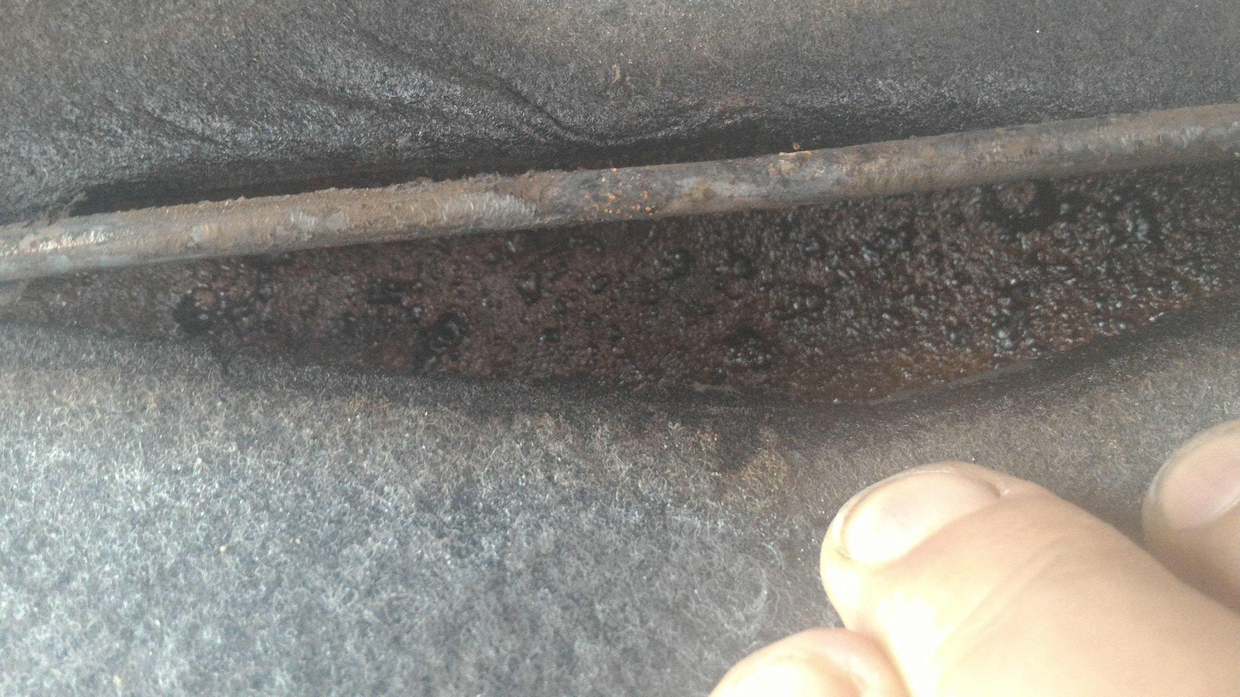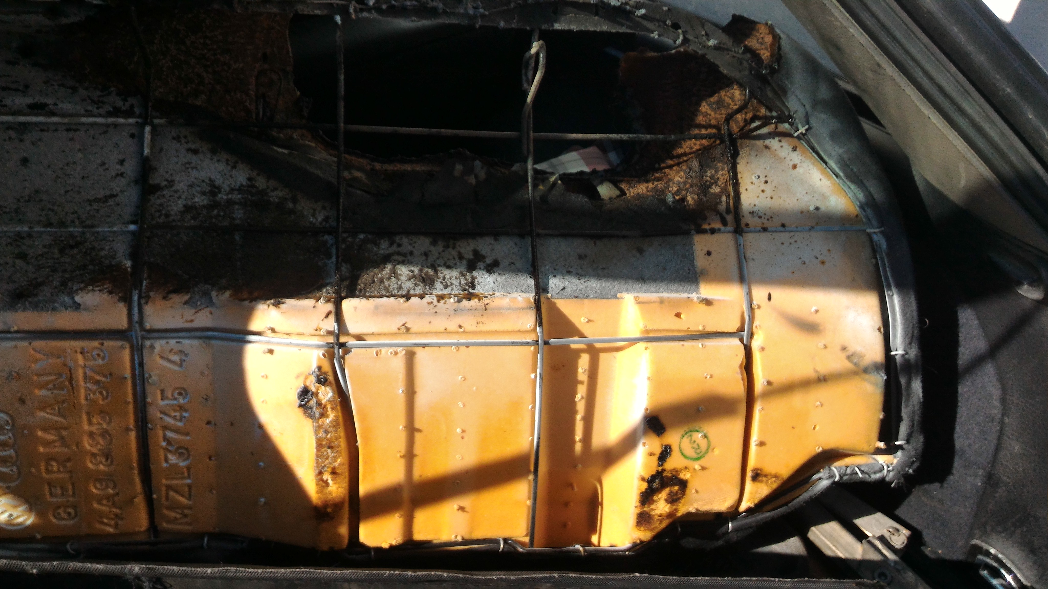 Als ich dann zufällig nochmal auf meine angebruzelte Rückbank schaute fiel mi etwas auf, das ich noch nicht gesehen hatte: Das ist genau in Höhe der Batterie! Aber warum hat es dann auf der anderen Seite gebrannt????