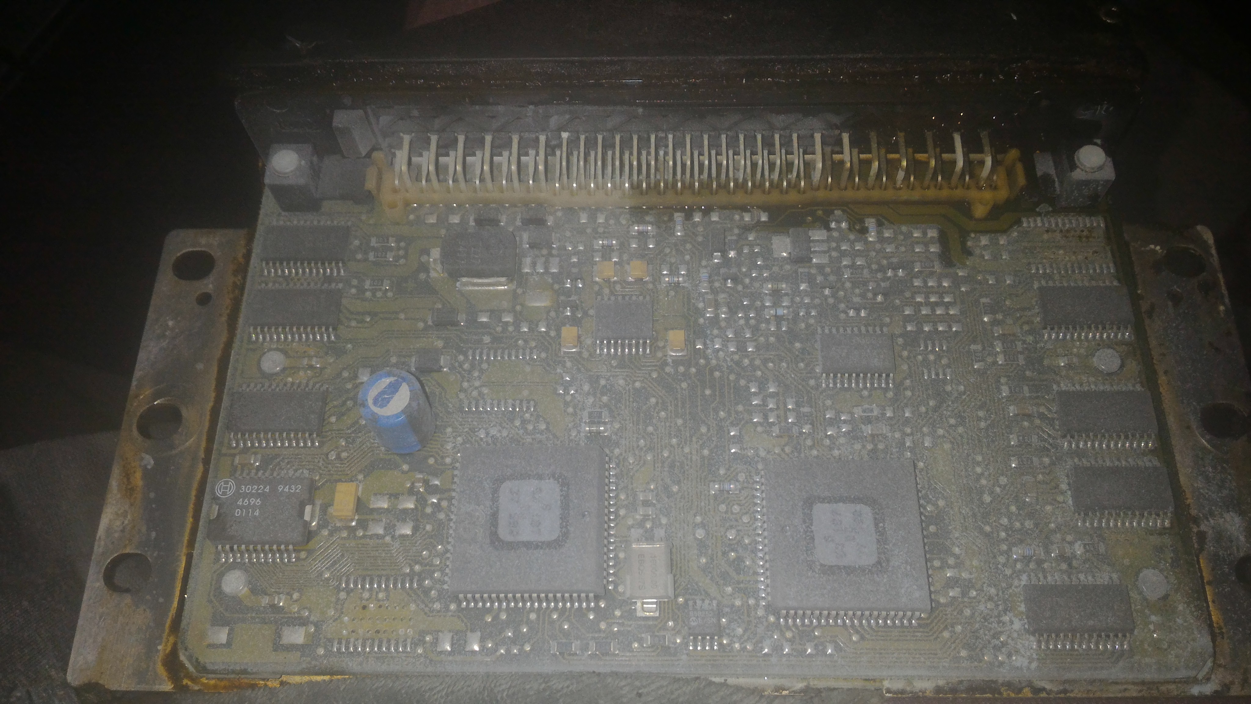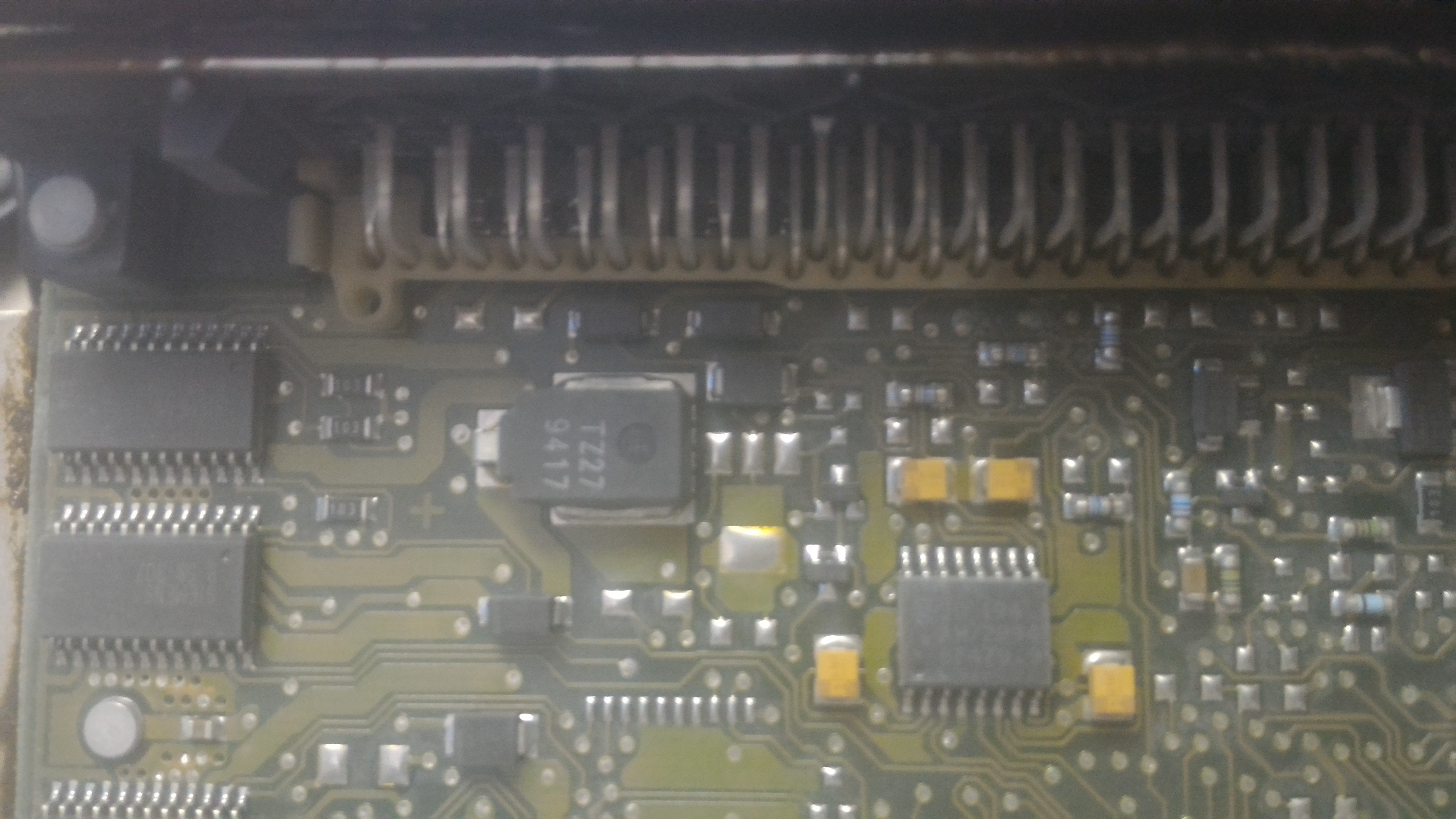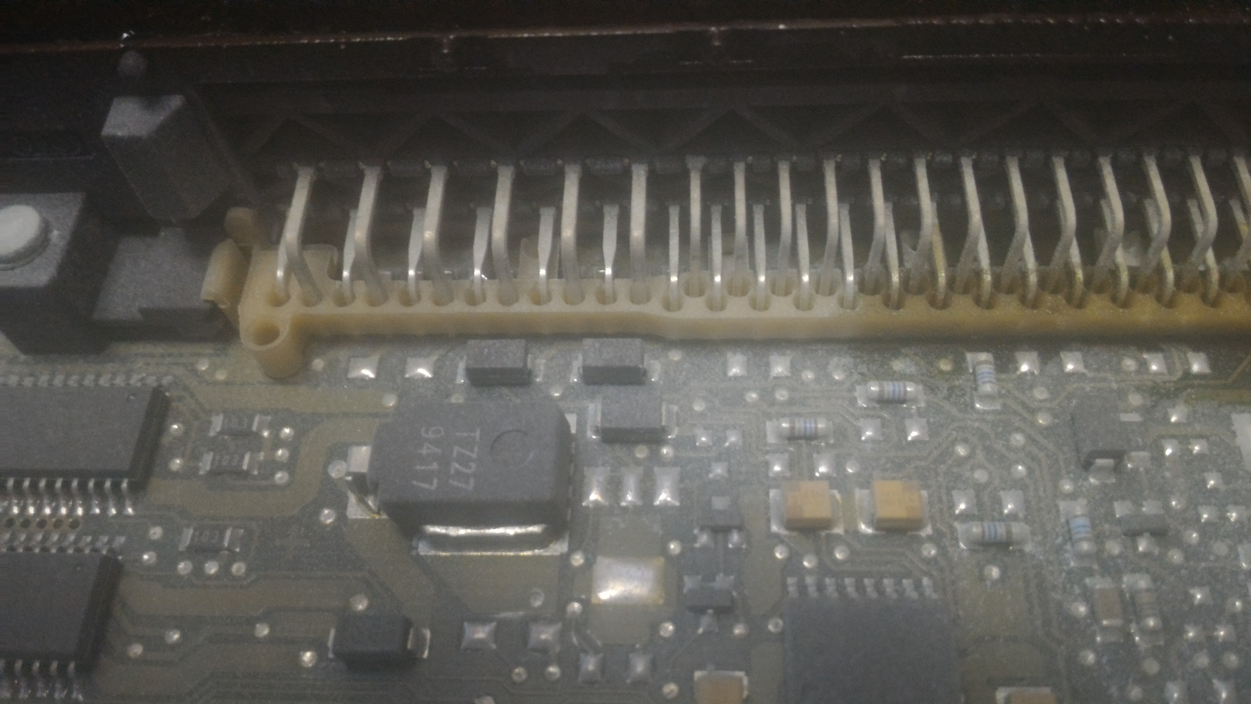 4. Die Pinne am ABS-Steuergerät sind auch alle sauber. Ich habe also das ABS-Steuergerät ausgebaut und geöffnet. Das Erste was ich sehen konnte war....Löschstaub! Die Platine ist soweit nicht auffällig. Leider ist die an sechs Punkten mit dem Trägerblech vernietet. Ich müsste also die Nieten abschleifen um die Platine von unten sehen zu können. Fakt ist, es gibt nur einen feuchten Bereich und da weiß ich nicht, ob der beim Putzen entstanden ist oder beim Schmelzen. Es gibt jedenfalls soweit keine Schäden an den Kunststoffteilen. Ich habe keine Ahnung, was sich da erhitzt haben könnte. Ich hoffe mal, wenn ich mir die Kabel näher ansehe, dass dann eine Erleuchtung kommt.