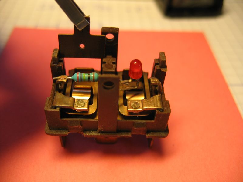 der Widerstand der LED ist hier übrigens am Minuspol angelötet! Wenn du eine neue rein machst, solltest du auf die Polung achten.