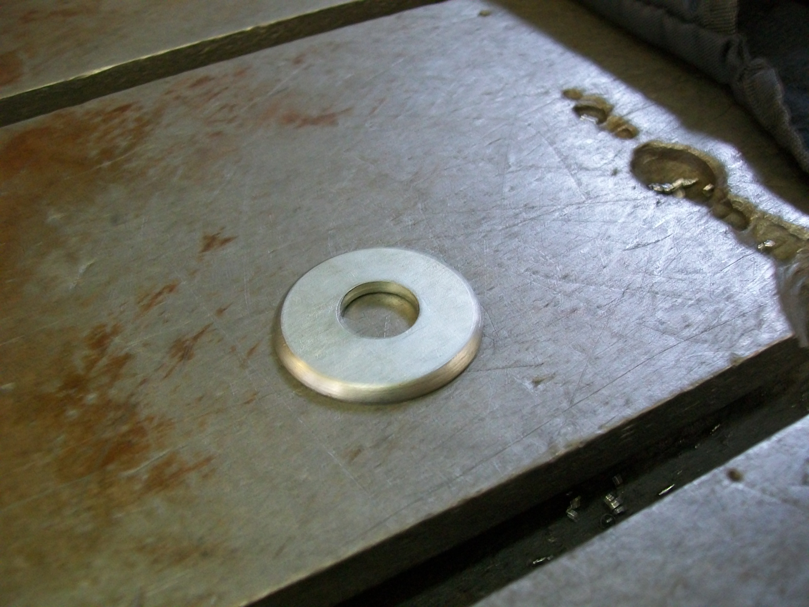 - Verschraubung QL innen an Hilfsrahmen oben und unten mit ebenfalls selbstangefertigten grösseren Unterlegscheiben versehen, um diese Krafteinleitungsstelle definiert zu verstärken, da das Blech vom Hilfsrahmen ja nur rund 2mm dick ist an der Ober- & Unterseite. U-Scheiben oben und unten unterschiedlich im Durchmesser um punktuelle Belastung des Hilfsrahmens am Randbereich der Scheibe zu vermeiden.