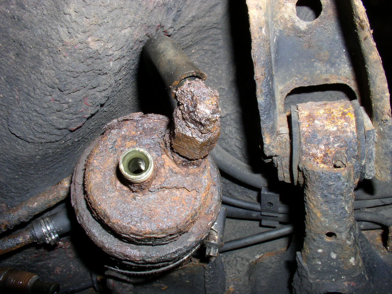 Das Bild in deinem Beitrag ist vom Fronti, das sieht bei mir etwas anders aus, die defekte Leitung ist aus Kunststoff, die enden sind speziell, wovon die Druckspeicherseitige schlichtweg durchgerostet ist, anbei mal ein paar Bilder, die rostigen Klumpen an den Enden des neuen Schlauch sind die originalen Teile, den Kleinen mußte ich dann noch tauschen, gegen einen Schlauchnippel 6 mm mit Überwurfmutter M14x1,5 90° gebogen, ist ein Normteil.