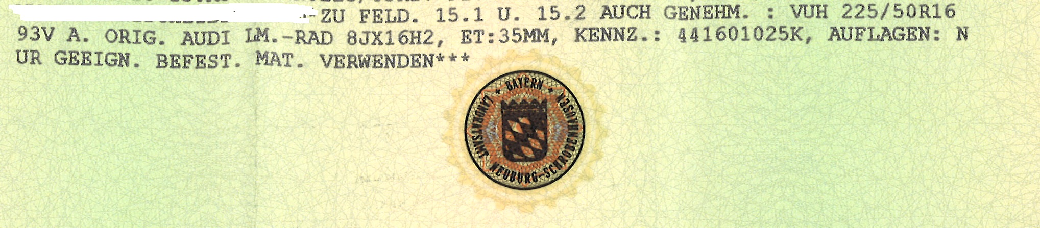 Üder die Auditeilenummer kann man beim freundlichen einen Festigkeitsnachweis besorgen und dann die Räder per Einzelabnahme eintragen lassen.