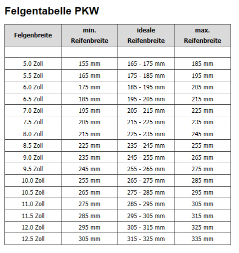 Leider ist diese Tabelle schon etwas in die Jahre gekommen: auf meine 16" BBS wollte ich auch schmälere Reifen als die 225er aufziehen. Leider nicht möglich, da es mittlerweile eine vorgeschriebene Mindestreifenbreite für jede Felgenbreite gibt. Es sei denn, der Reifenhersteller gibt eine Freigabe, dass sein Reigen auch auf eine breitere Felge montiert werden darf.