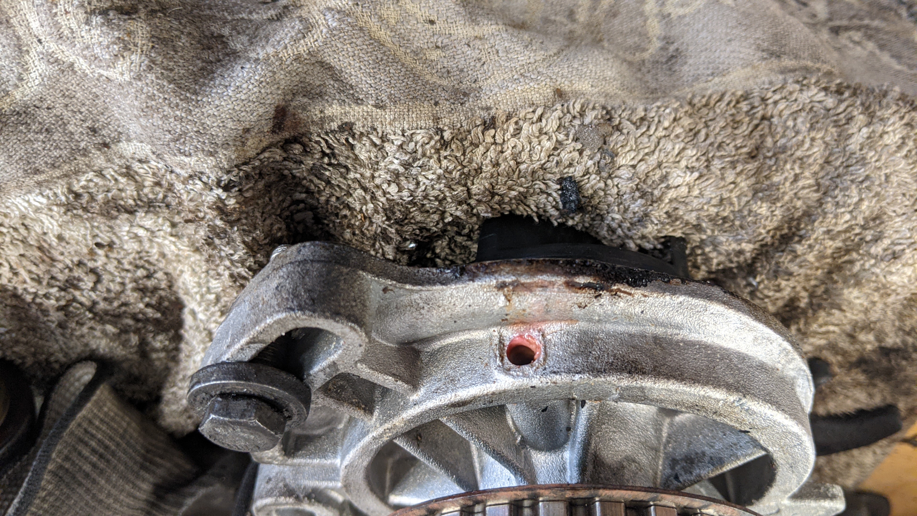 Da am Motor auch nicht viel gewartet wurde habe ich den auch zerlegt. Die Wasserpumpe habe ich vor 10 Monaten/15tkm eingebaut als ich den gekauft habe. Allerdings tropft das Kühlwasser aus diesem Loch raus. Ist da ein Überdruckventil oder ähnliches drin, oder ist die Pumpe bereits hin?
