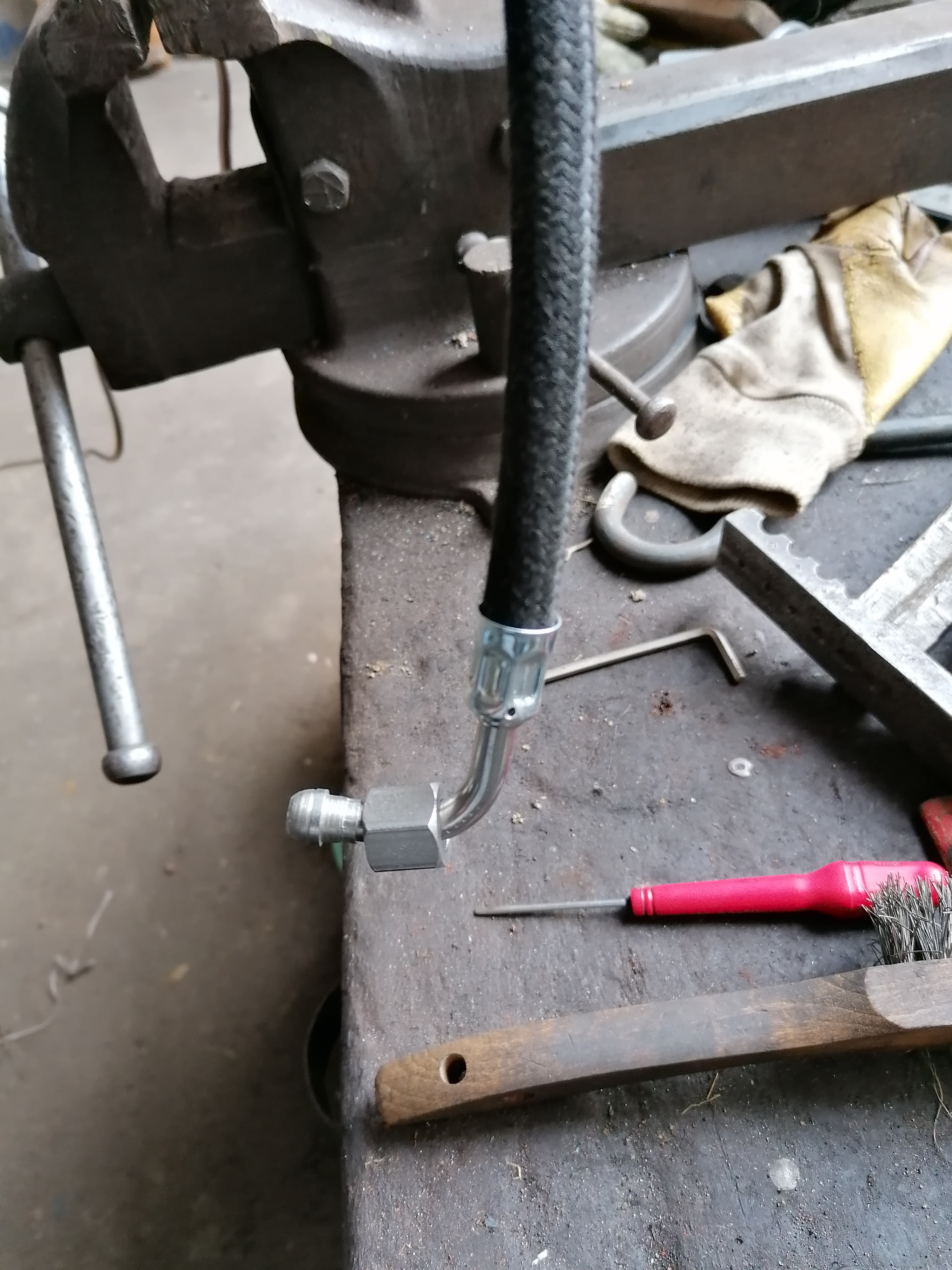 Ich habe die Stahlleitungen auch gegen Kunifer getauscht. Das Ende kann man mit dem Bördelgerät leicht anformen sodass eine Abrutschsicherung für das Schlauchende entsteht. Den Schlauch habe ich dann mit 2 2-Ohrschellen doppelt gesichert. Das andere Ende am Druckspeicher (Winkelanschluss) hab ich direkt beim Hydraulikfuzzi mit 3 Meter Schlauch verpressen lassen. In der Werkstatt hab ich den dann passend gekürzt und auf die Vorlaufleitung geschoben. Die 2 Schellen drauf und gut ist. Und es war noch genug für die Rücklaufleitung übrig.
