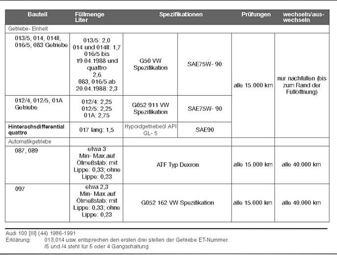 Ich würde bei meinem Audi 100 Avant 10V Turbo MC quattro gerne die Öle der Getriebe wechseln. Ist nach 300000 Km wahrscheinlich nicht verkehrt welche Spezifikationen und welche Mengen brauche ich denn dafür?