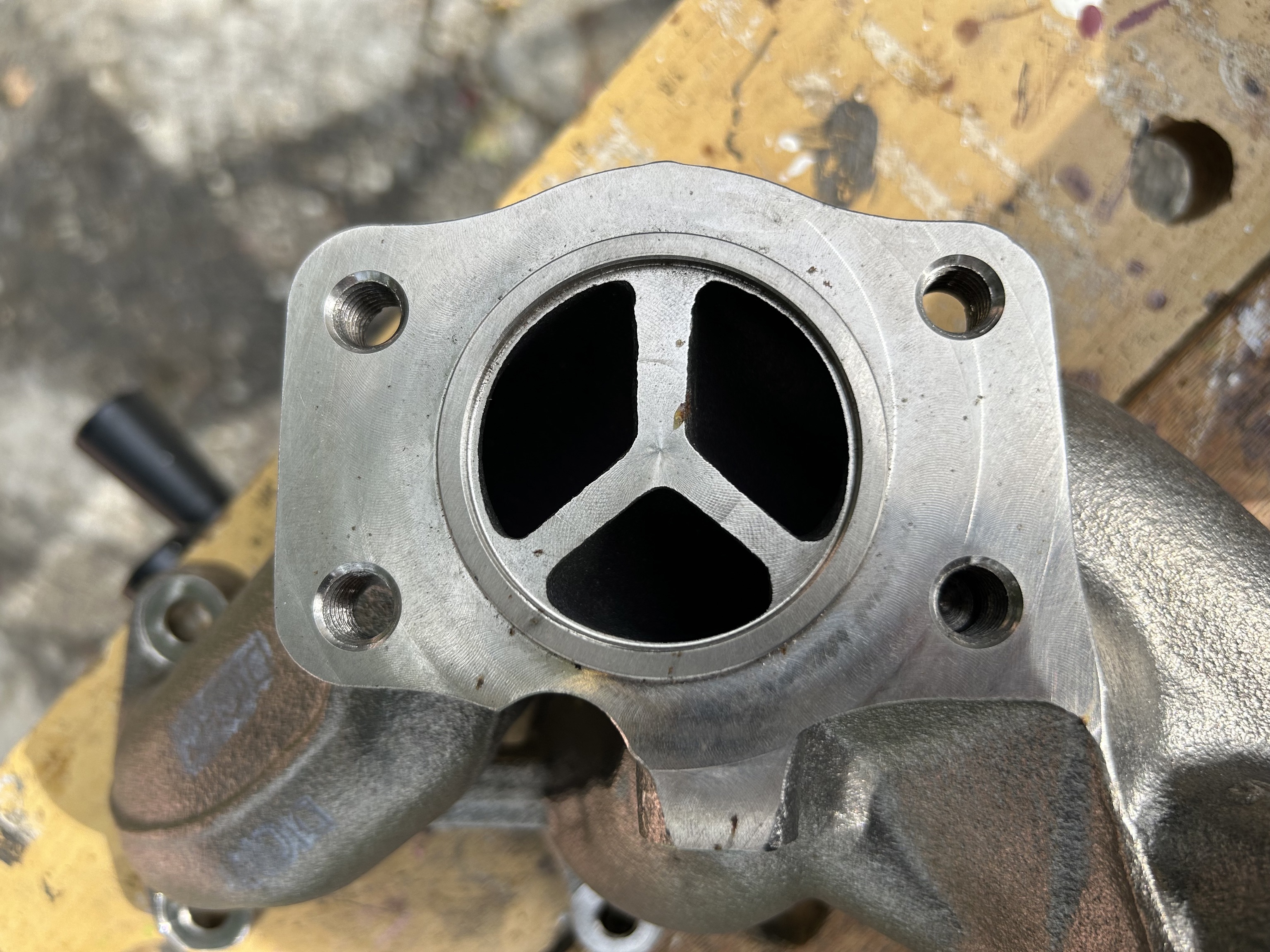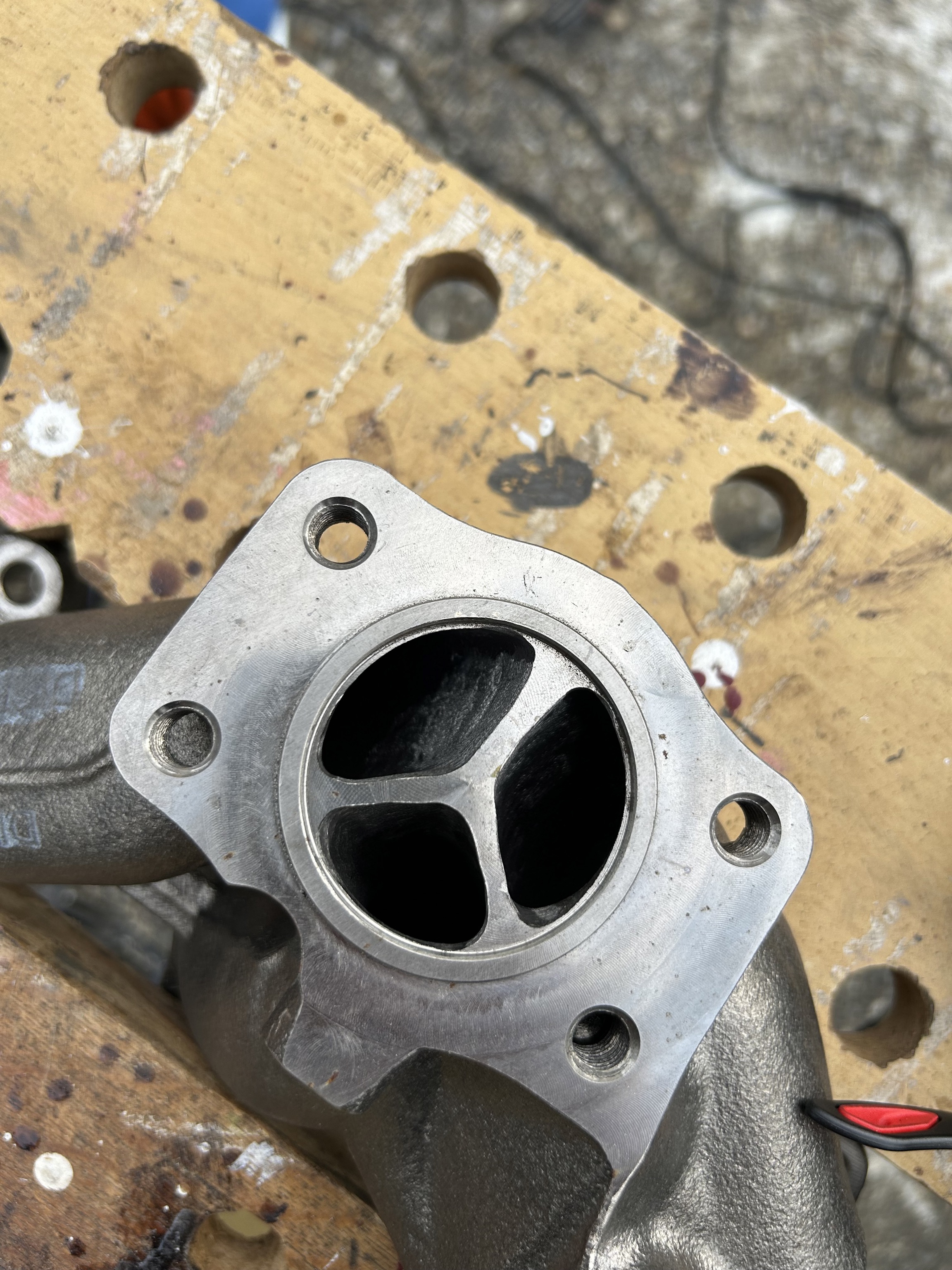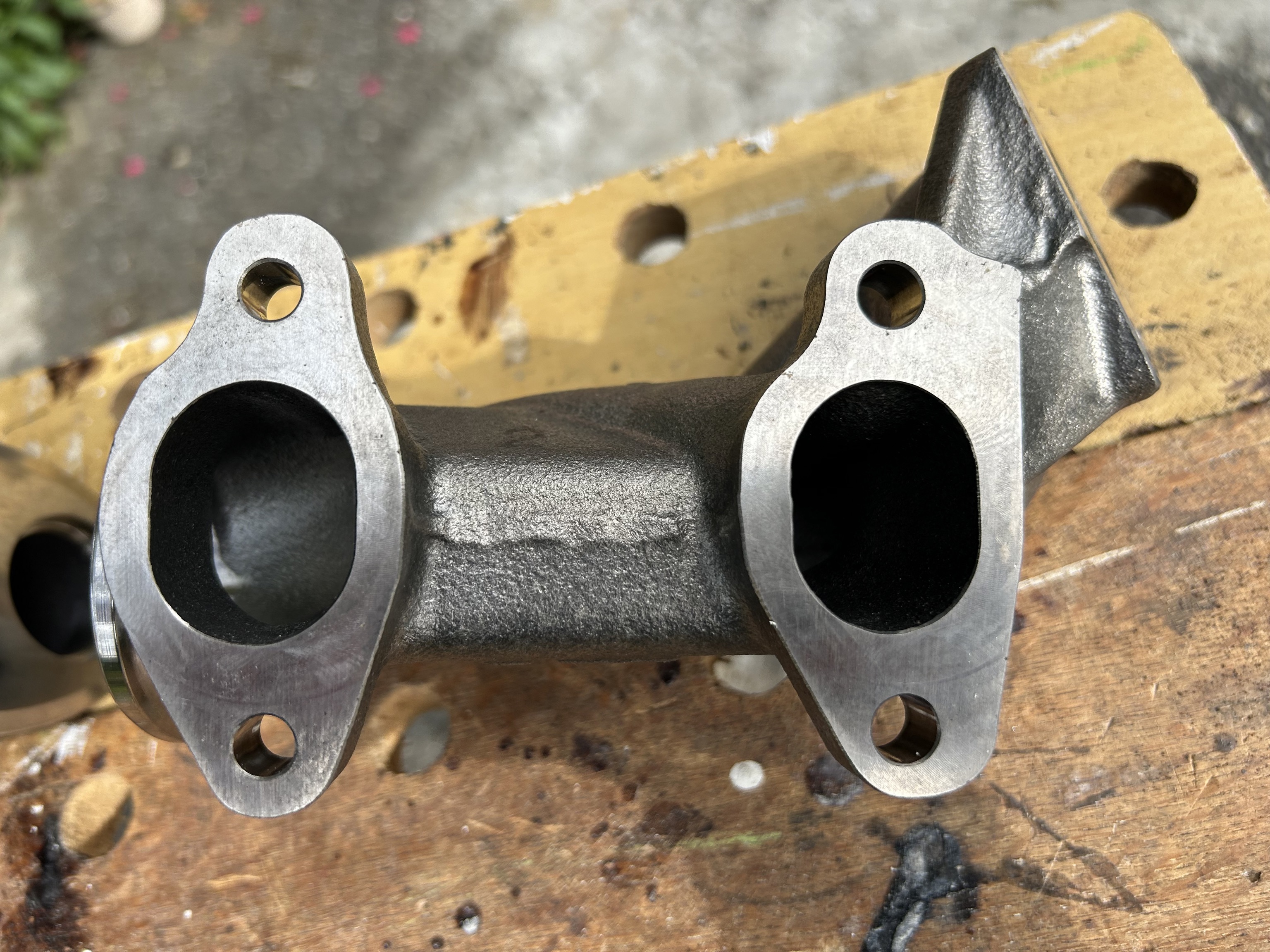 nebenbei noch was anderes, während der ganzen rum schrauberei habe ich mir noch den 2-Teiligen Krümmer besorgt und dessen Einlässe auf Dichtungsmaß geweitet und danach etwas glatt geschliffen.
