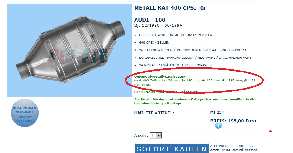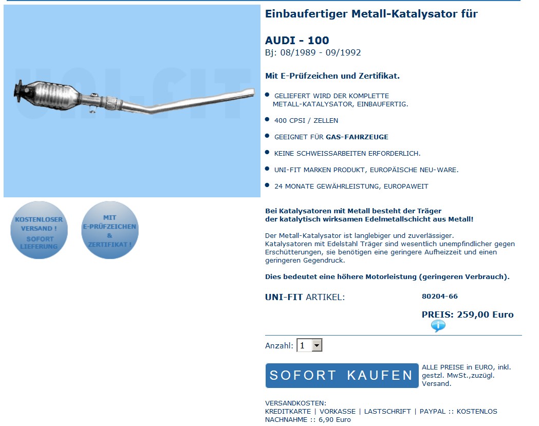 Ich rüste gerade so nach und nach alle Wagen auf 400-Zeller-Metallkat um. Bei Unifit gibt es jetzt einbaufertige Metallkats mit EU-Zulassung. Kosten so ca. 259 €. Bis dato habe ich die im Audi 90 und im Audi 100 Avant verbaut.