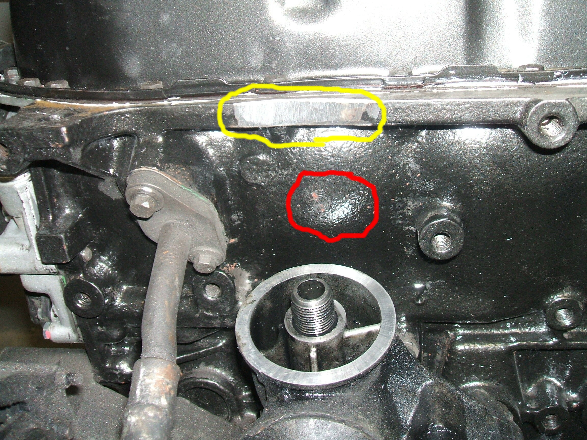 Jetzt baut aber der AAB- Block im Bereich wo der Ölfilter hin kommt etwas weiter nach außen, so daß sich der Ölfilter um ca. 5mm nicht einschrauben läßt. :evil: Erst dachte ich es liegt nur an der unteren Kante wo die Ölwanne aufliegt(gelber Kringel) und hab da mit der Flex etwas Platz geschaffen, leider liegt der Filter aber jetzt im Bereich vom Block selber auch noch an(roter Kringel), wo ich mir jetzt kein Material weg nehmen getraut hab, da ich nicht weis wie dick die Wandung dort ist...