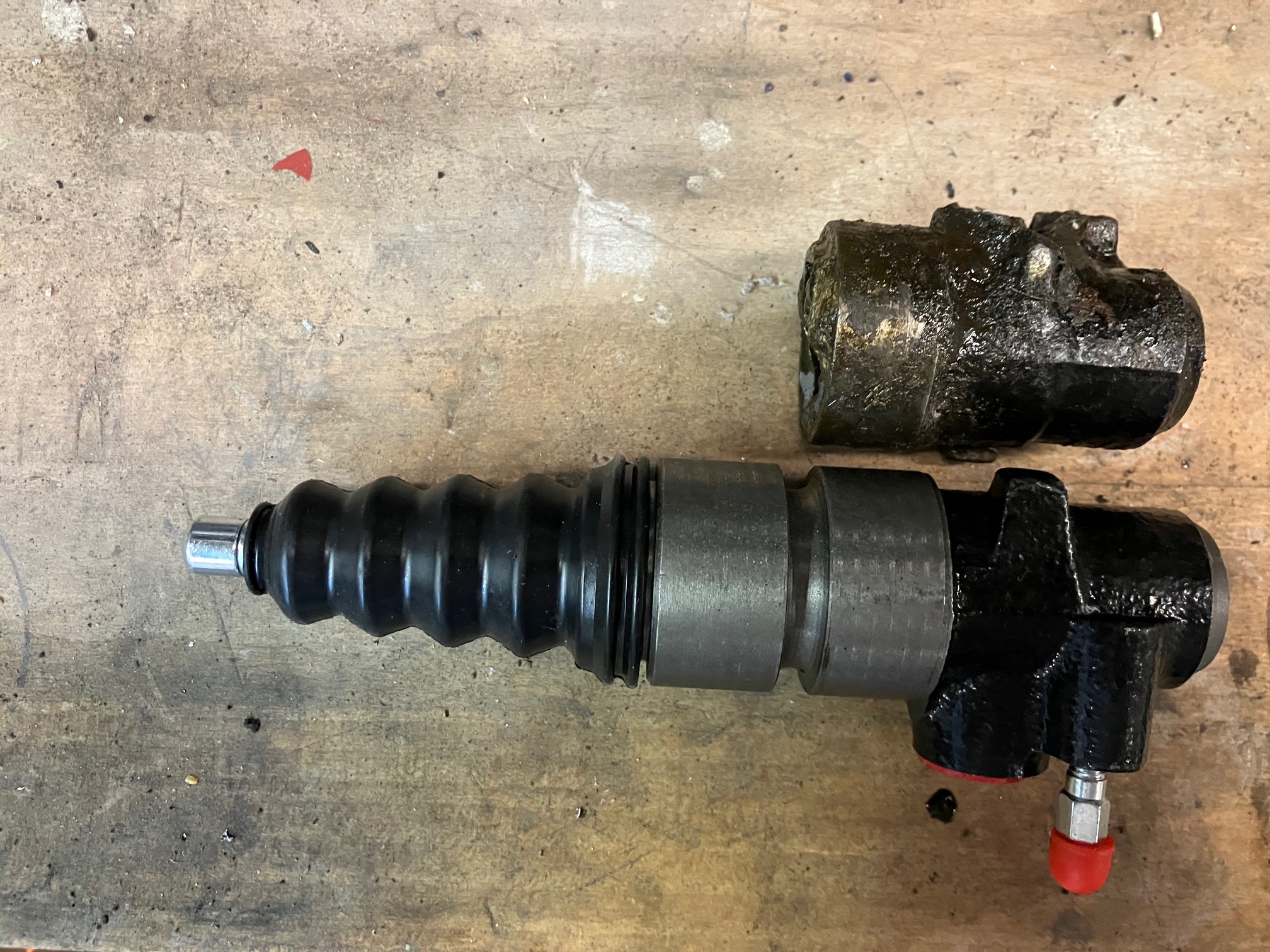 Er ist an der Nut (für den Sperrstift) gebrochen und der vordere Teil des Nehmerzylinders steckt noch im Getriebe.