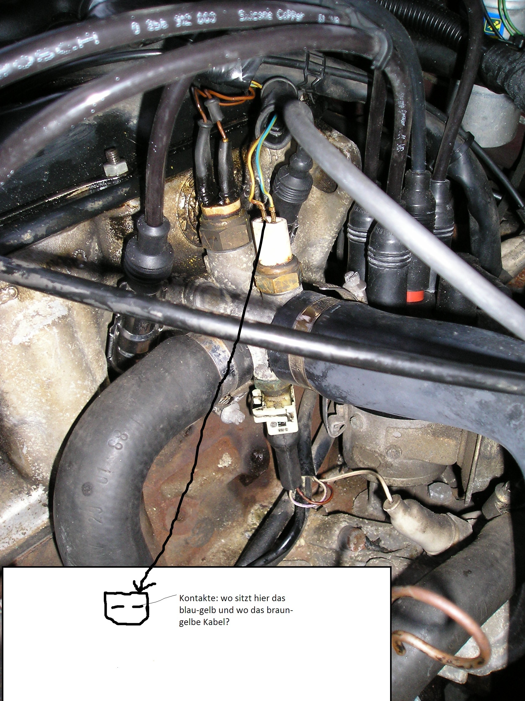 Das Durchmessen geht tatsächlich so: im warmen Zustand, Motor aus, alle Kabel ab und dann Multimeter auf Ohm, schwarz an Masse - also Motor - und rot an die Pins. Bei einem zeigt das MM was an, beim anderen nicht. Dann Kabel nach Belegung aufstecken und siehe da die Anzeige funktioniert. (Dank an Blixman, der mir den Tipp gegeben hat)