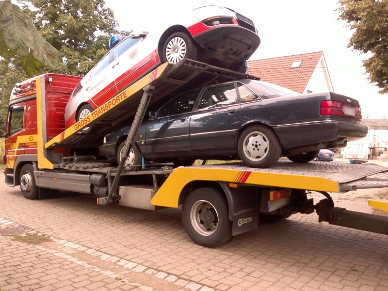 In der Tat, das erste Telefonat war vielversprechend und der abgemachte Termin passte mir sehr gut. Am Vorabend des vereinbarten Transports rief mich ein sehr freundlicher, fließend deutsch sprechender Fahrer an und teilte mir mit, er wäre zwischen 10 und 11 zum Abholen bei mir, falls was dazwischen kommt würde er sich melden. Und so kam es auch. Um 10:02 fuhr ein Atego der Firma Gross vor, beladen mit zwei neuen E-Klasse Kombis und einem etwas älteren Passat Variant. Da mein Auto per Winde verladen wurde, mussten die Mercedes weichen und wurden erstmal entladen... Eine Show für's ganze Dorf, alle dachten ich hätte groß eingekauft.