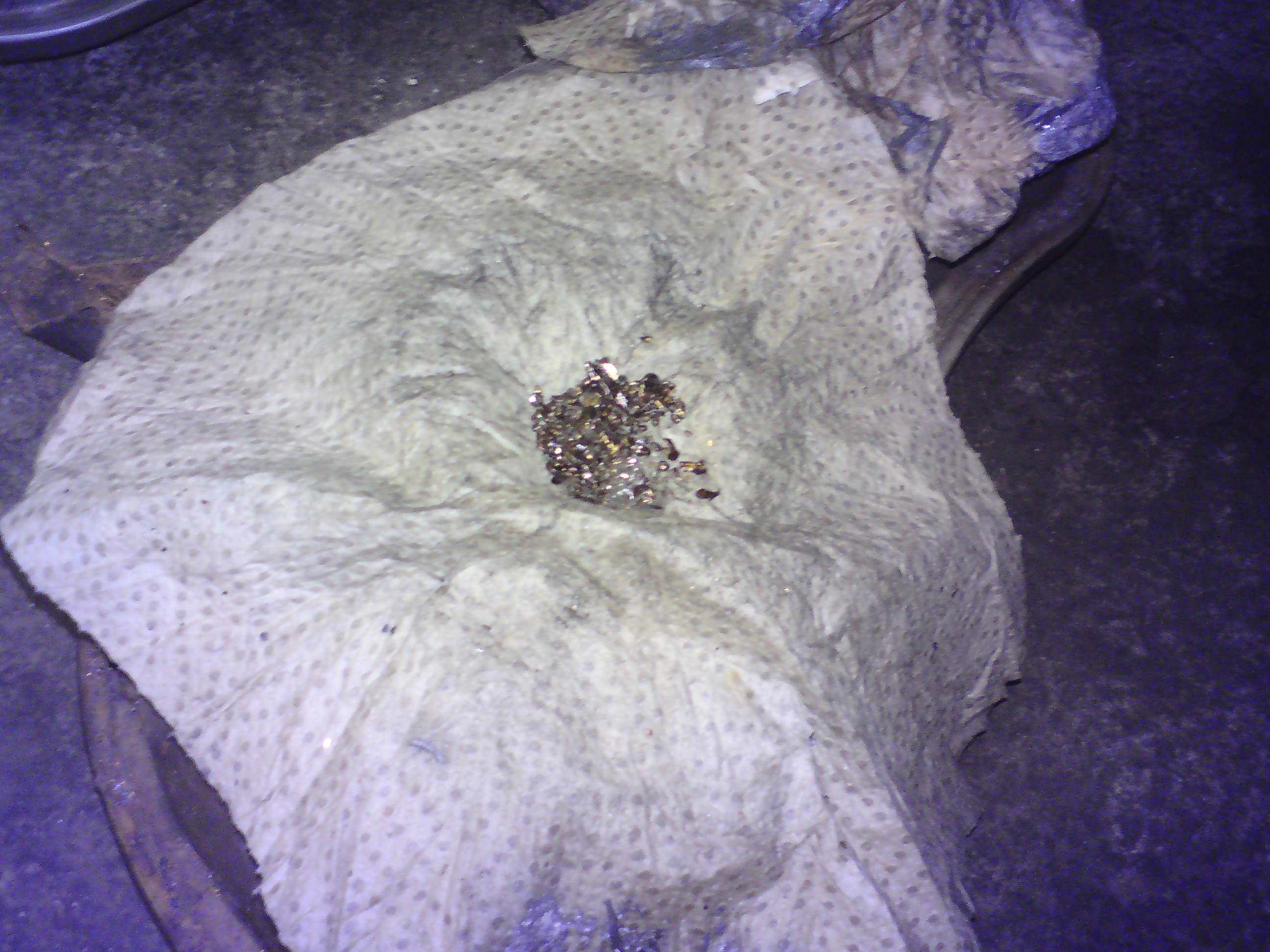 - Ein Häufchen nicht magnetischer Späne vor der Ablassschraube (also innen im Öl schwimmend), Partikelgröße bis 3 mm x 3 mm x 0,5 mm, ungefähres Volumen des Haufens entspricht dem einer M10er Mutter (Hab den Kram mal ausgefiltert...).