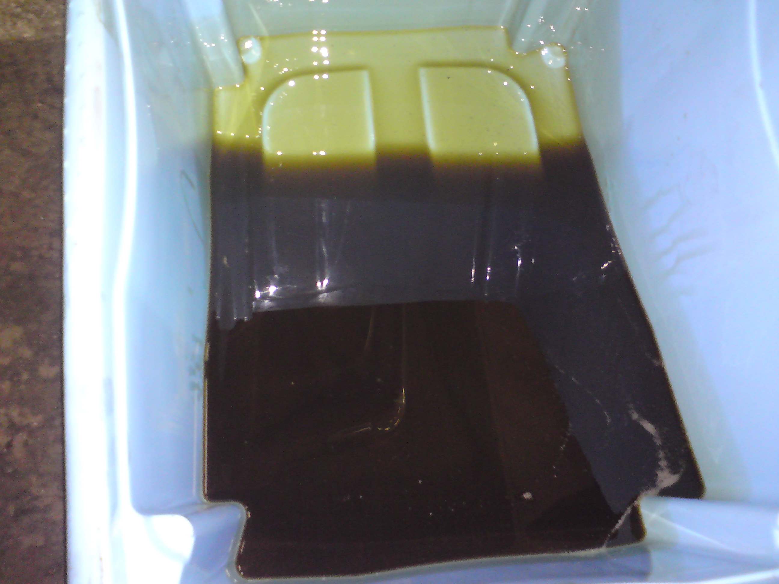 - Das Öl ist dunkelbraun bis schwarz mit feinen Partikeln