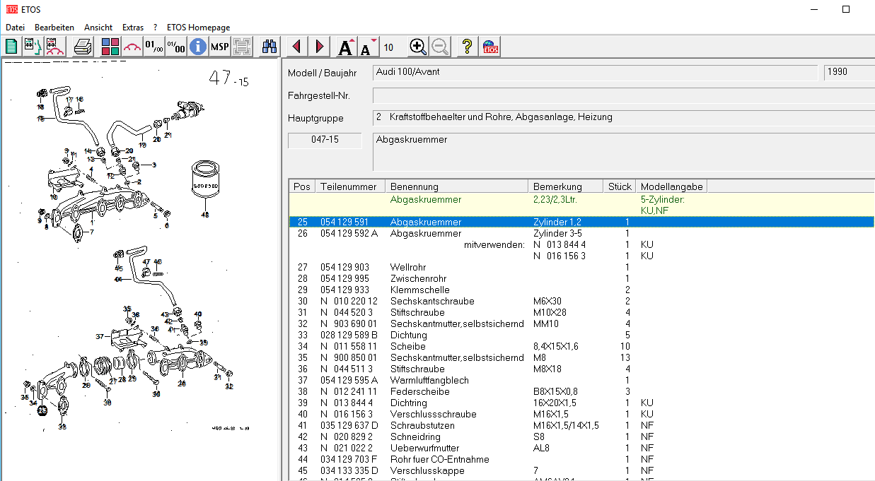 Untergruppe. Hier wählt man dann Abgaskrümmer 2.0 - 2.3 5-Zylinder, es öffnet sich dann die Unterüberschriftenübersicht, hier