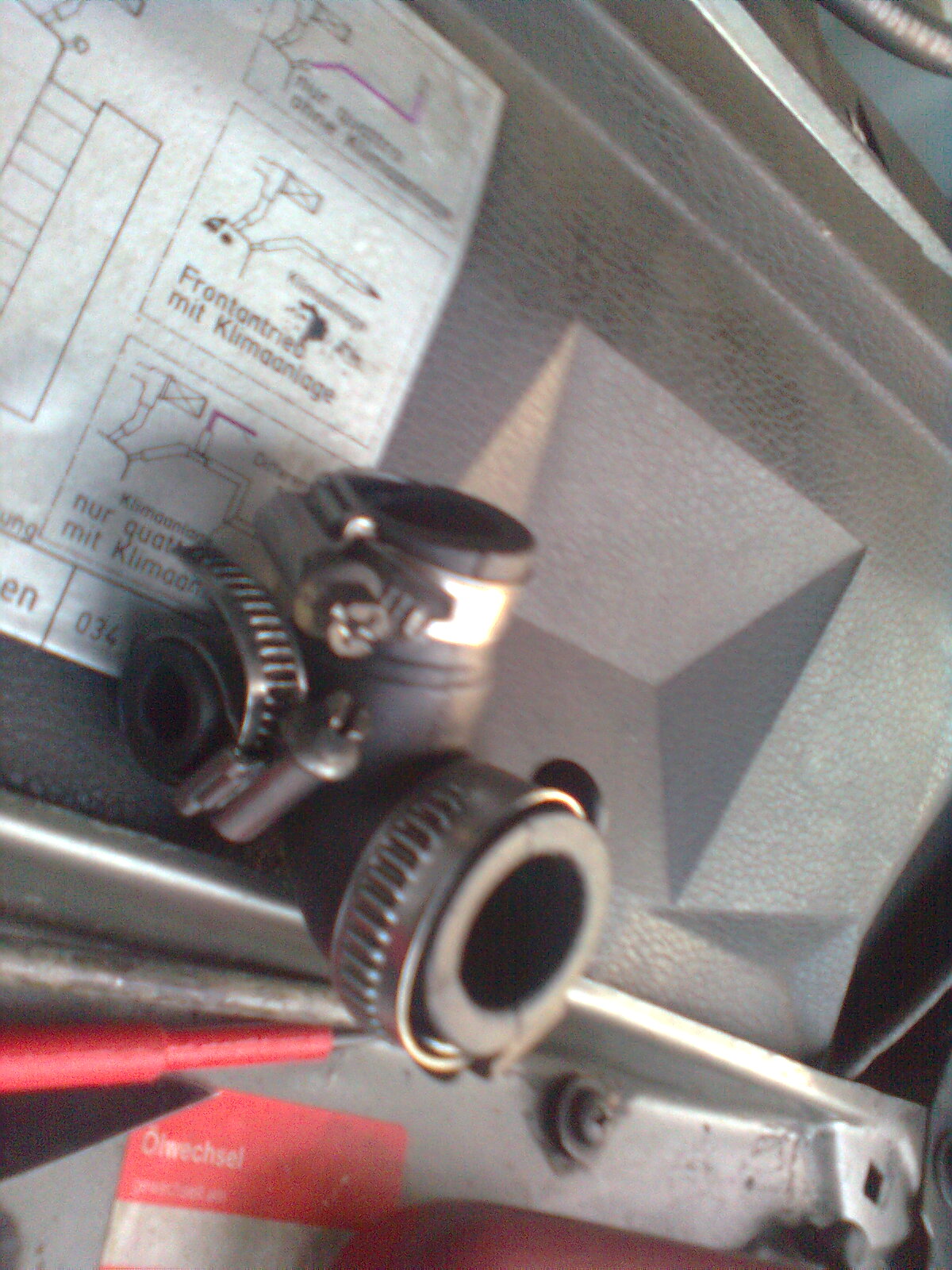 Eine weitere Falschluftquelle könnte die Entlüftung des Ventildeckels sein, hier war der Schlauch locker wegen kaputter Schlauchschelle. Wird noch ersetzt.
