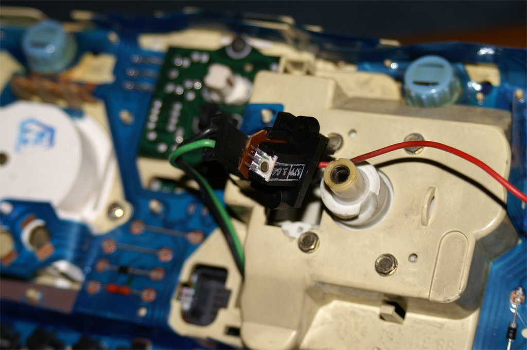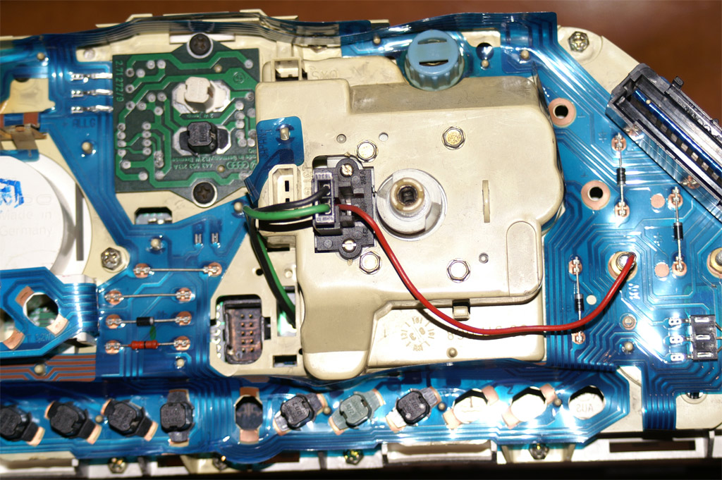 Wie man auf dem Bild vom Tacho sieht, gehen vom Geber zwei Kabel an das Bordcomputer-Innenleben, werden dort als Signal für den BC aufgearbeitet und theoretisch in den Kabelbaum eingespeist.