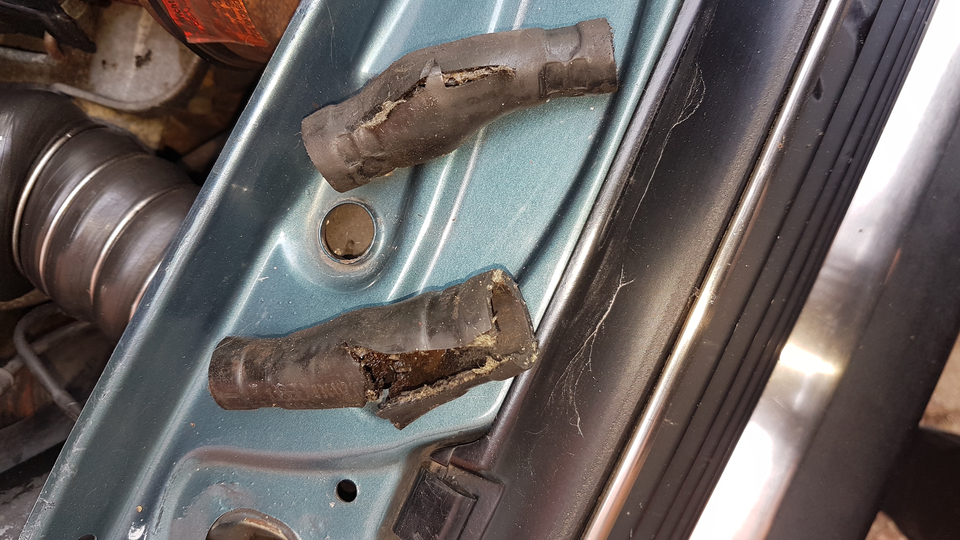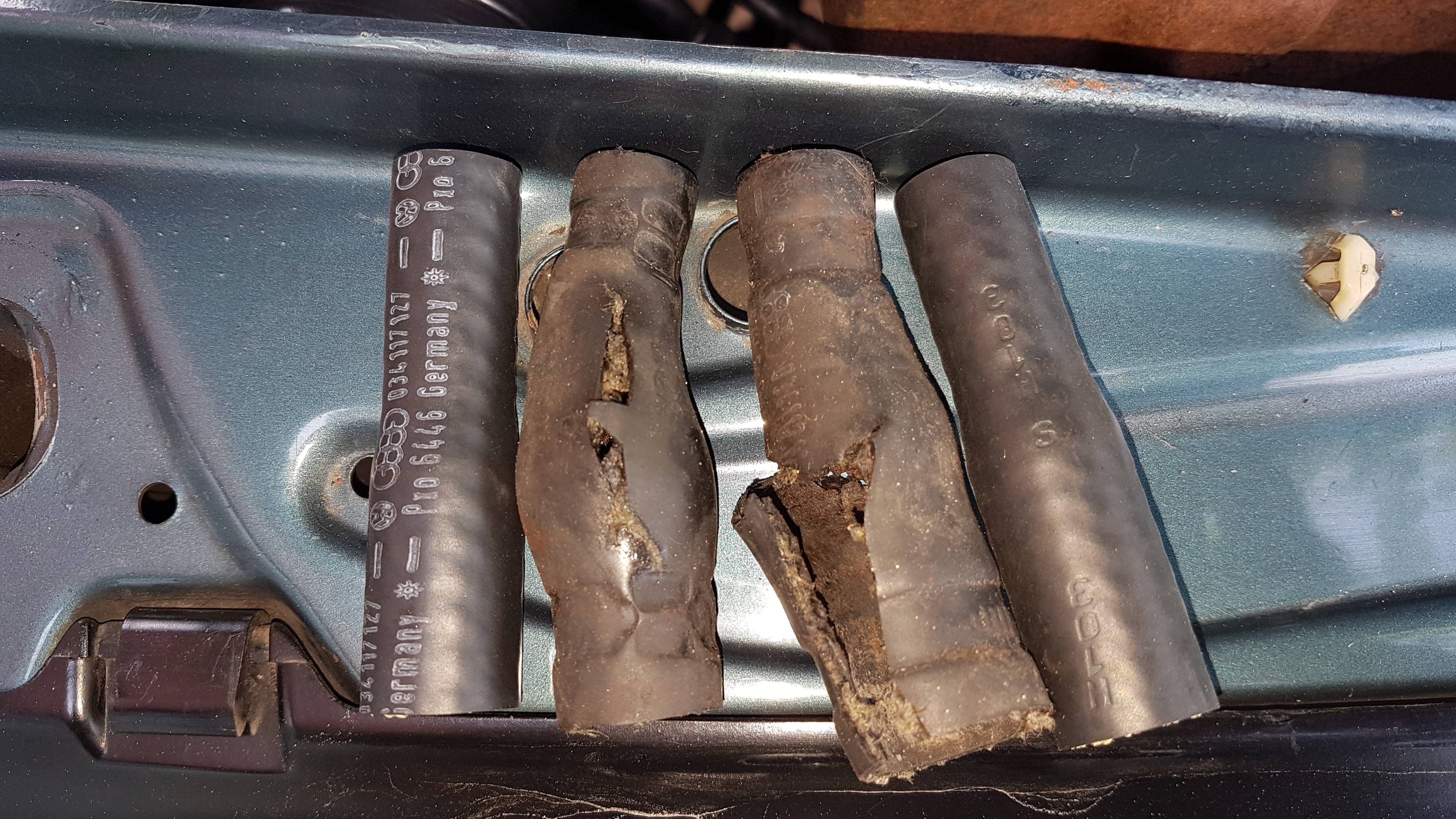 Hier sieht man das Mahleur, den geplatzen Schlauch Der rechte Schlauch ist so in Längsrichtung geplatzt, der linke Schlauch war so bröselig das er beim Hebeln mit einem Schraubendreher einfach weggebröselt ist. Hier sieht man den Vergleich zu den neuen Schläuchen. Keine Frage wie alt meine waren. Die Schläuche haben die Nummer 034 117 127 und kosten bei Audi Tradition 12,00 Euro. Empfehlung ist natürlich auch neue Schellen zu verwenden