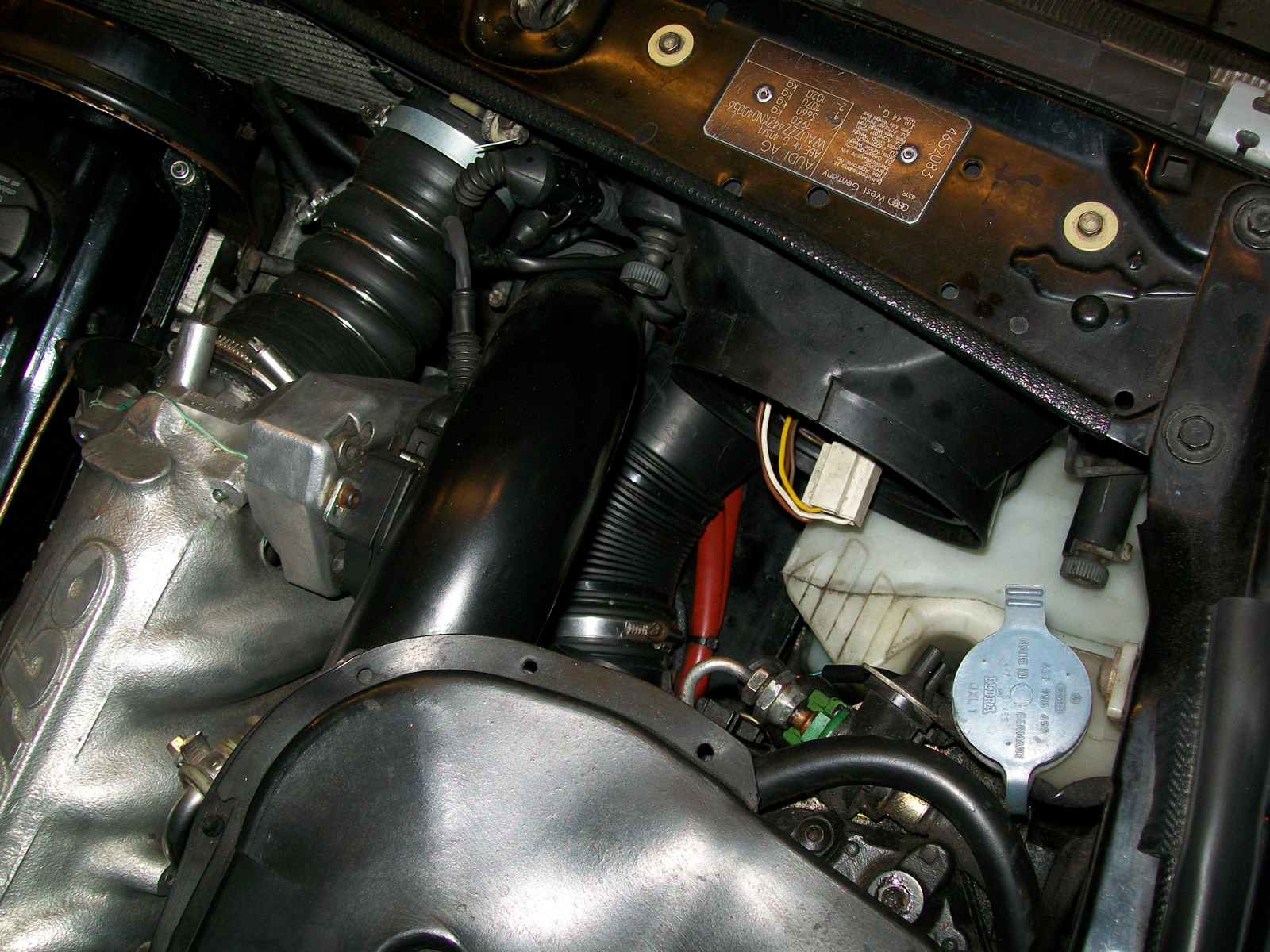 Diverse C4-Motoren, u.a. auch der AAR, saugen ihre Kaltluft über dem (nicht über den ;) ) Hauptkühler an, der ja beim C4 wieder VOR dem Motor sitzt. Das Ansaugrohr, Teilenr. 4A0 129 617 F, hat eine flache, breite Einlassöffnung, die zwischen Schlossträger und Hauptkühler passt. Von dort geht das Rohr ca. zwischen Zahnriemenabdeckung, Krümmer und rechtem Scheinwerfer nach unten. Fragt sich, ob das am 44er auch passen würde...