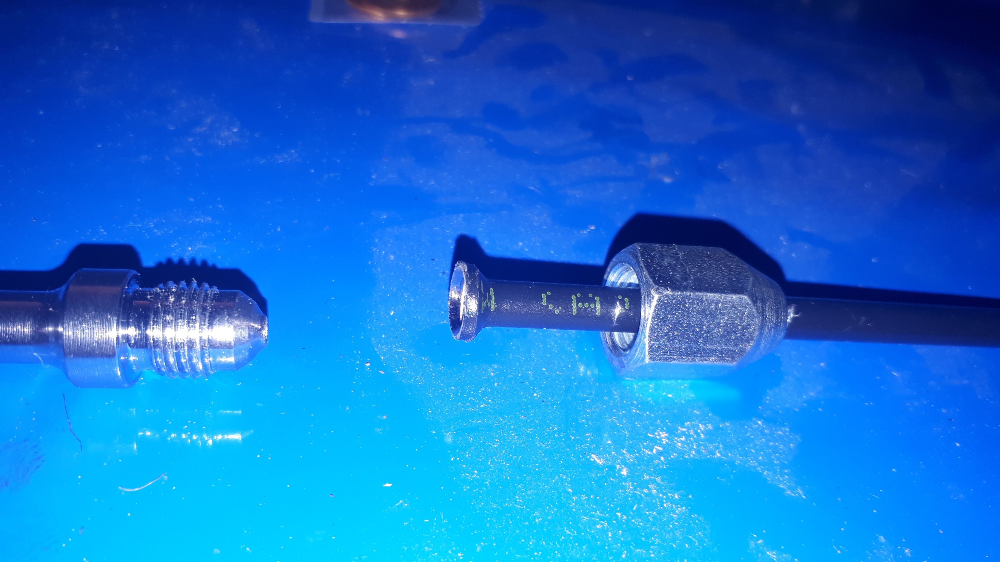 Danach wurde das Rohr samt Druckstück mit der Überwurfmutter an einem ESV montiert. Durch das Druckstück wird aus dem SAE Bördel der Kegeldichtsitz des ESV`s: