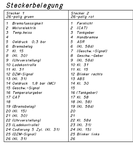 ich hab hier mal einen Schaltplan des KI, allerdings noch vom 100er C4. Beim A6 gab es die Zeichnung so in der Form leider nicht mehr. Da es eine zum Teil unterschiedliche Belegung bei den Anschlußsteckern gibt, hab ich Dir mal die zum Schaltplan gehörige, als auch die für den A6 ab 95 drangehängt.
